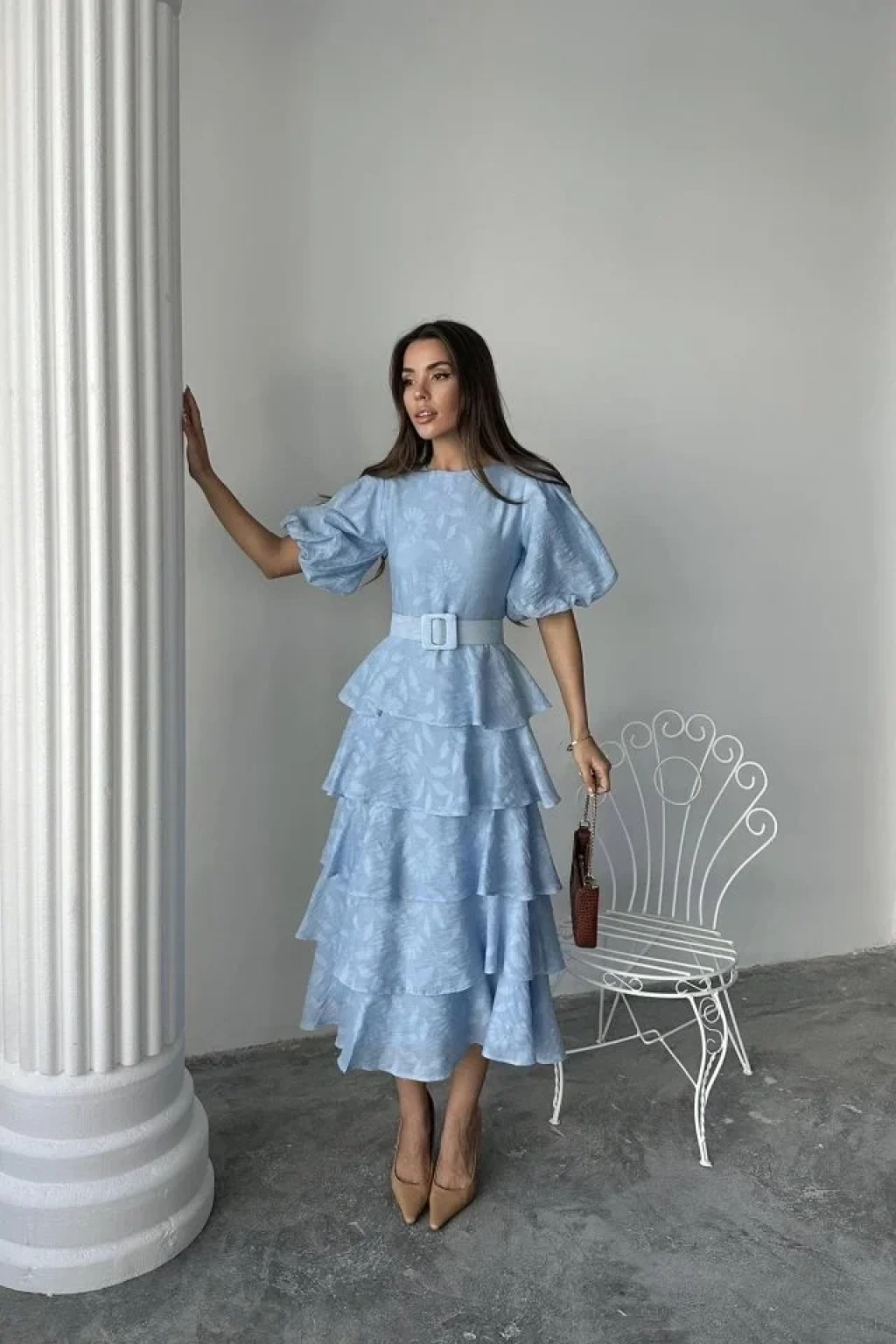 Bebe Mavi Kat Kat Balon Kollu Kemerli Elbise