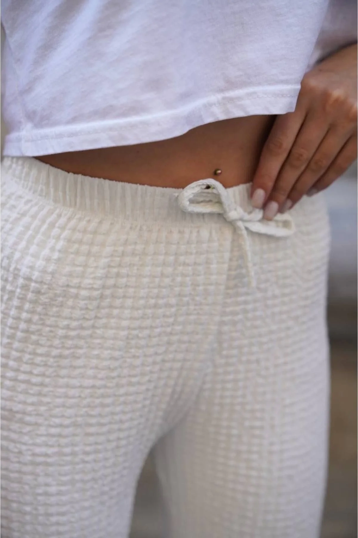 Bu beyaz gofre pantolonu, basic bir crop top veya beyaz bir tişört ile tamamlayarak fresh ve enerjik bir yaz kombini yaratın. Sandaletler, terlikler veya sneaker'lar ile tamamlayarak günün her anına uyum sağlayabilirsiniz.