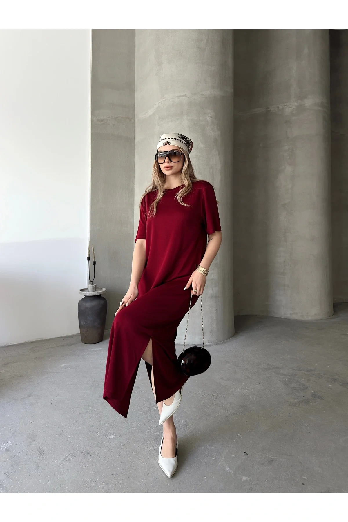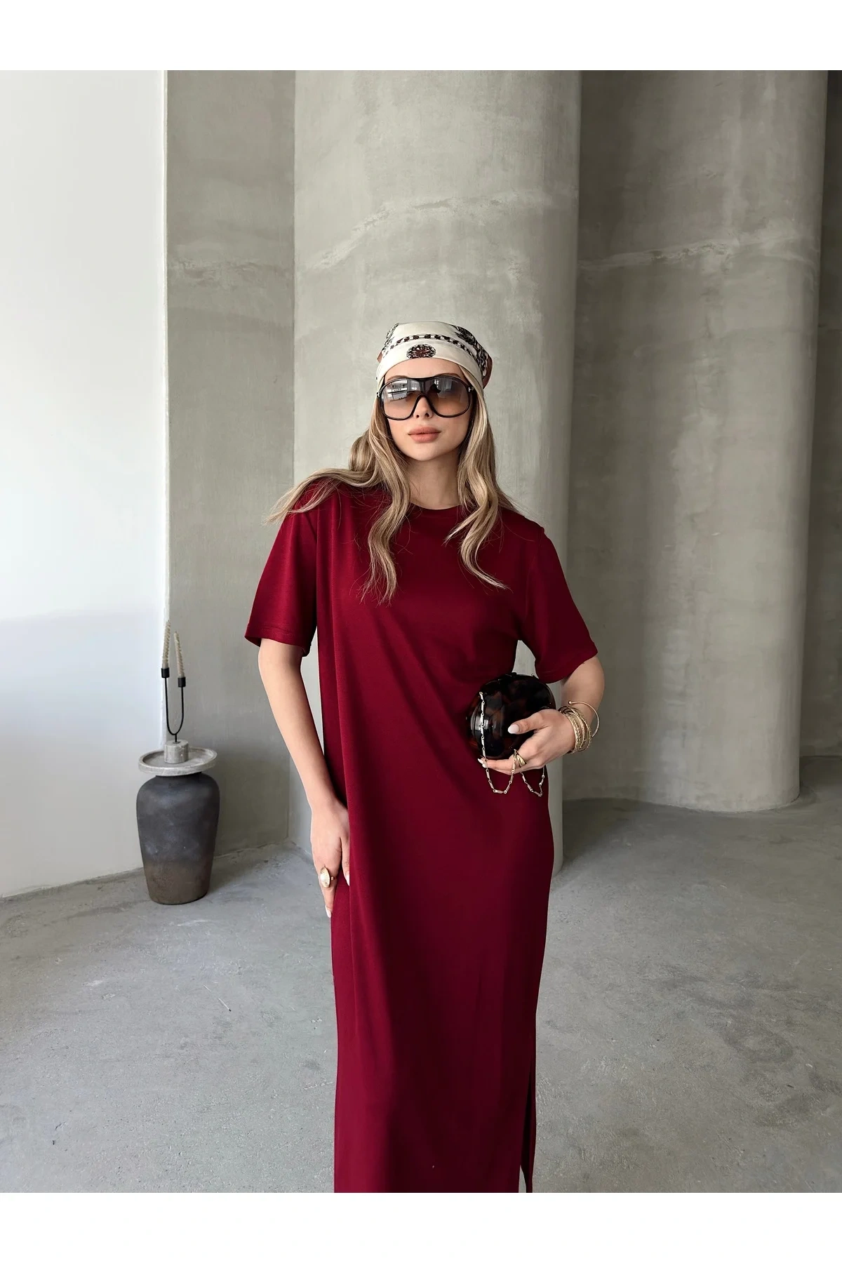 bysoca Kadın Bordo Rahat Kalıp Yandan Yırtmaçlı Modal Pike Elbise, zahmetsiz şıklığı ve üstün konforu bir araya getiriyor. Hem günlük kullanım hem de tatil anları için mükemmel bir seçenek olan bu bordo midi elbise, gardırobunuzun en rahat parçası olmaya aday.