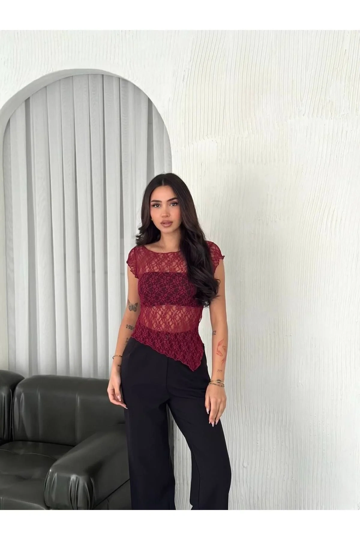 bysoca Kadın Bordo Kayık Yaka Asimetrik Kesim Transparan Dantel Bluz, romantizmi ve modern çizgileri bir araya getirerek sofistike bir stil vadediyor. Gecenin yıldızı olmanızı sağlayacak bu bordo dantel bluz, zarif detaylarıyla göz kamaştırıyor.
