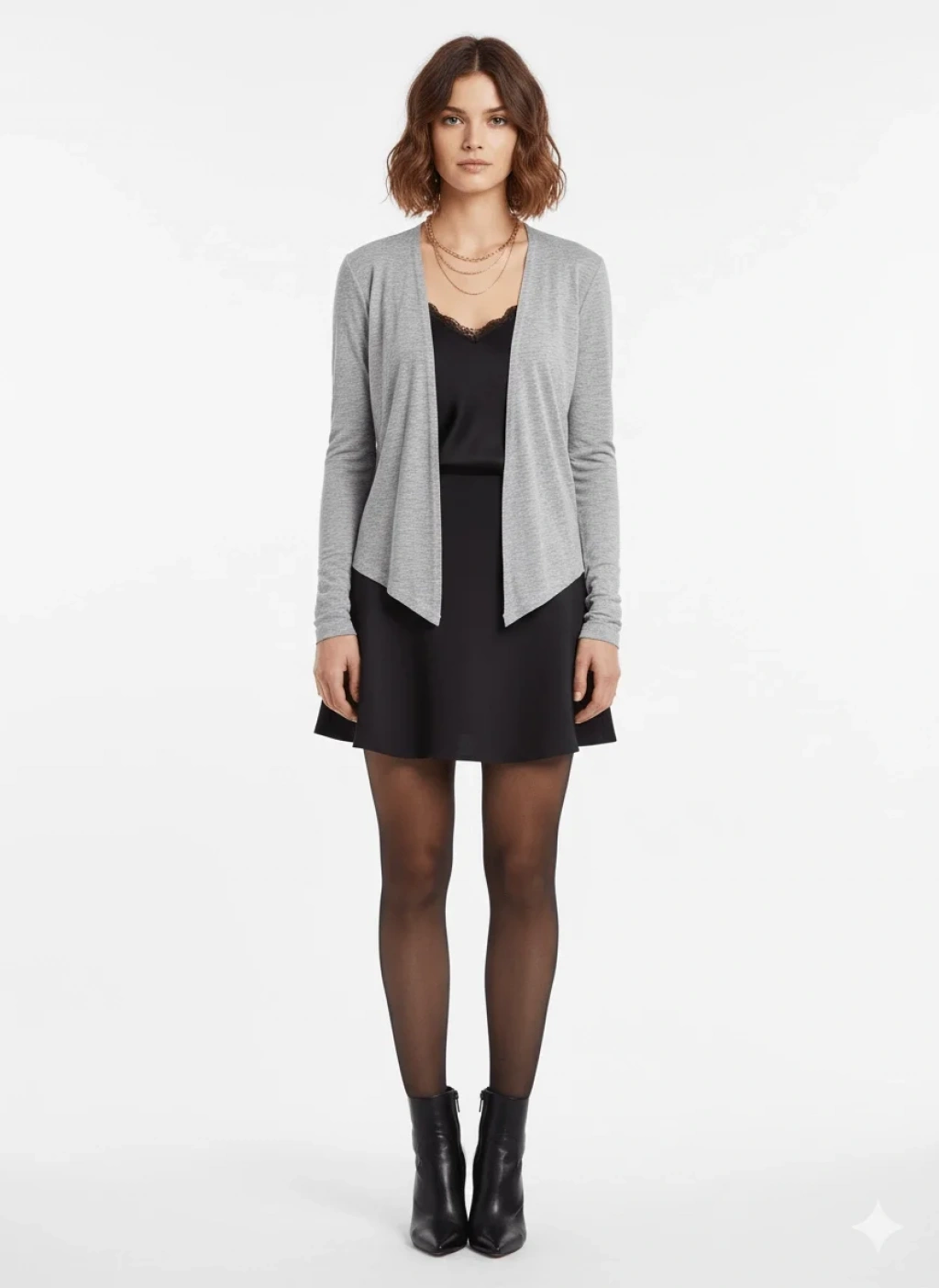 Bu gri asimetrik hırka, çok yönlü bir kullanım sunar. Siyah mini bir elbise ve topuklu botlarla tamamlayarak şık bir davet stili yaratın. Basic bir bluz ve kumaş pantolonla birleştirerek modern bir ofis kombini elde edebilirsiniz.