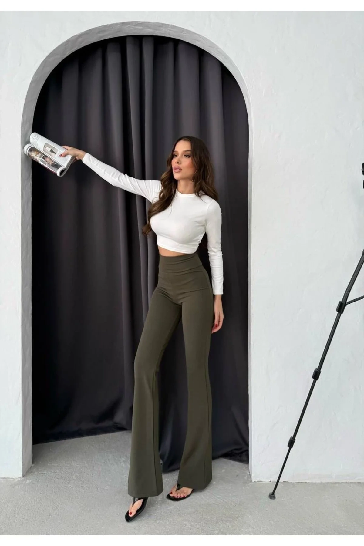 bysoca Kadın Haki Yüksek Bel Toparlayıcı İspanyol Paça Tayt Pantolon, şıklığı ve konforu mükemmel bir dengeyle sunuyor. Hem taytın rahatlığını hem de pantolonun zarafetini bir araya getiren bu haki İspanyol paça tayt, gardırobunuzun en çok yönlü parçası olacak.