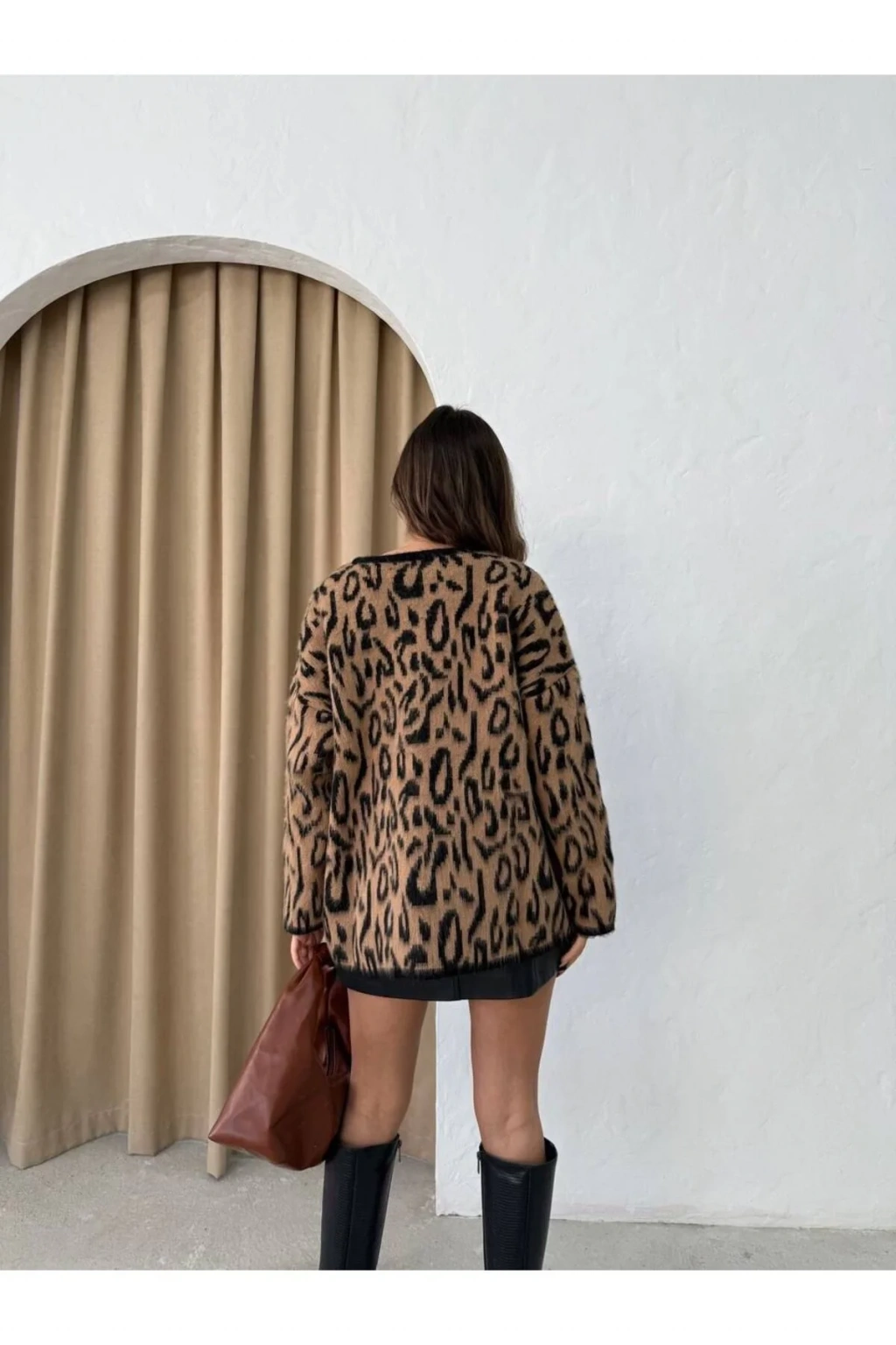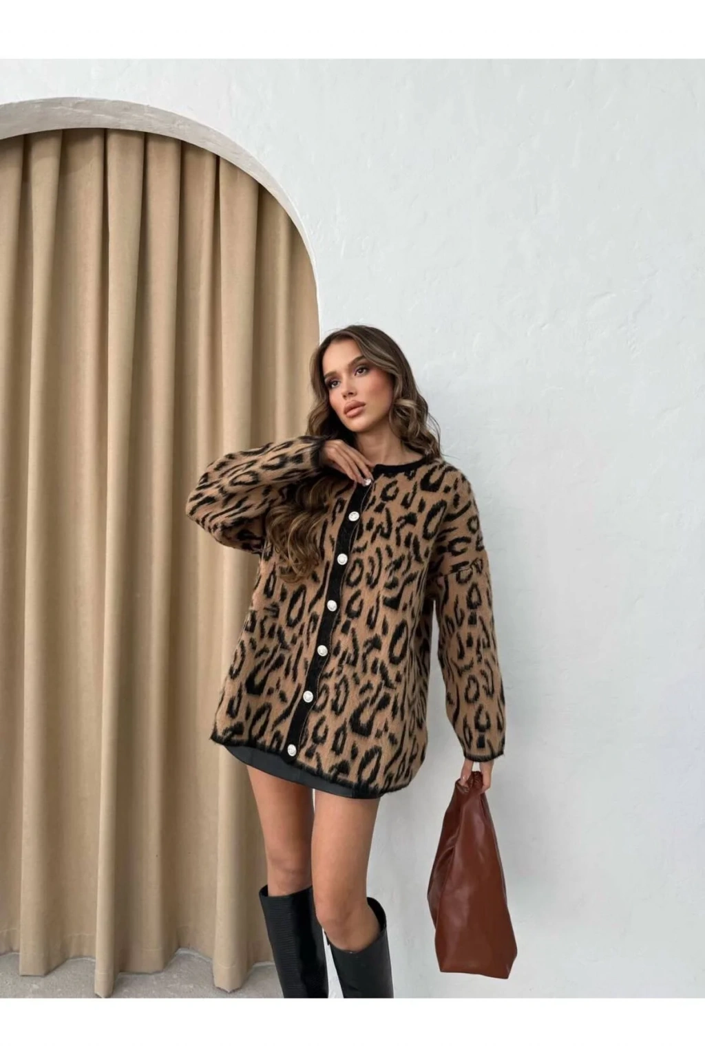 bysoca Kadın Krem Kahve Leopar Desenli Düğmeli Peluş Triko Hırka, soğuk kış günlerinde sizi sıcacık tutarken stilinize iddialı ve vahşi bir dokunuş katıyor. Hem şık hem de son derece konforlu bu leopar desenli hırka, gardırobunuzun en gözde parçası olacak.
