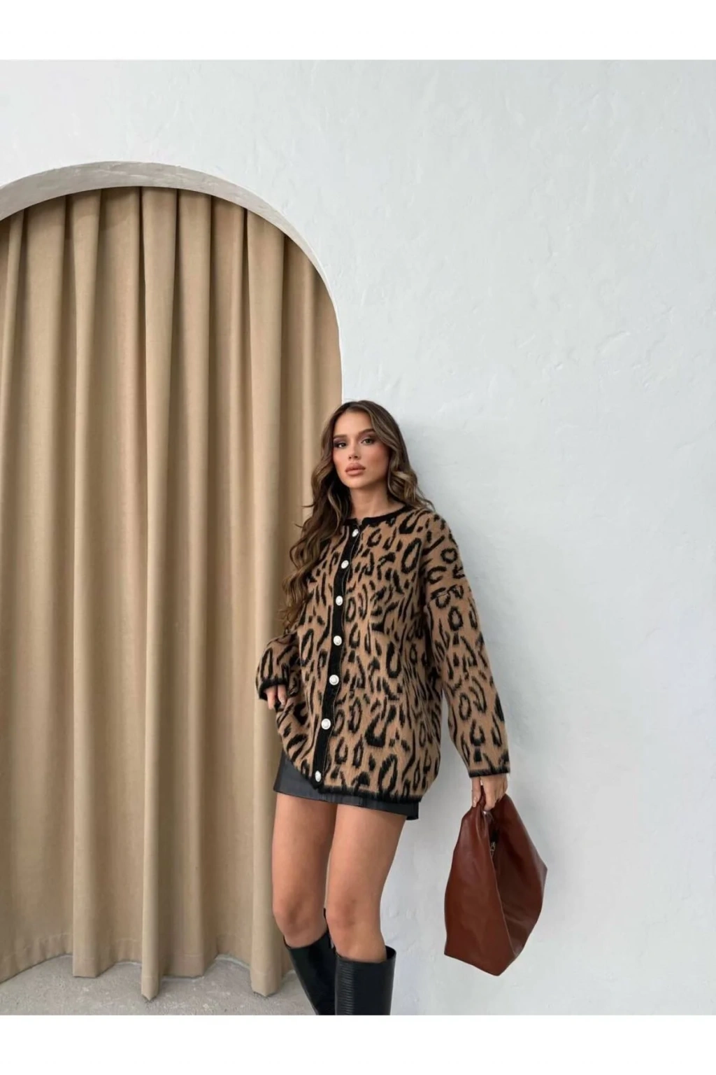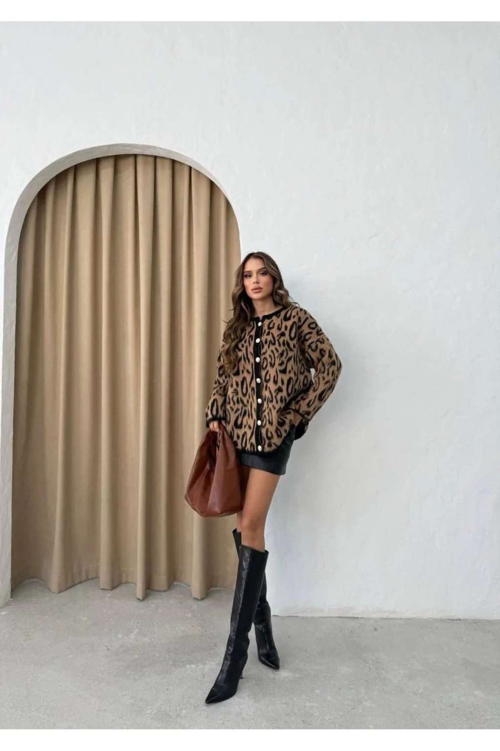 Bu leopar desenli triko hırka, kış gardırobunuzun en iddialı parçasıdır. Siyah deri bir etek ve çizmelerle tamamlayarak şık ve cesur bir görünüm elde edin. Daha sade bir stil için siyah bir body ve jean pantolonlarla kombinleyerek hırkanın desenini ön plana çıkarabilirsiniz.