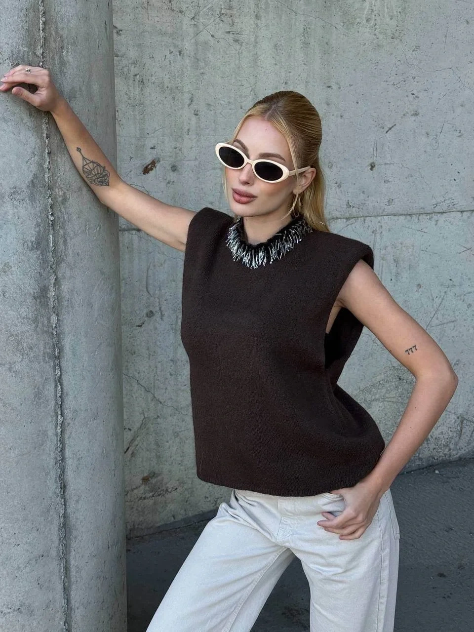 bysoca Kadın Kahve Rengi Yakası İşlemeli Vatkalı Triko Süveter, güçlü omuz detayı ve özgün yaka tasarımıyla sıradanlığın dışına çıkıyor. Hem bohem hem de modern bir estetik sunan bu kahve triko süveter, stilinize sanatsal bir dokunuş katacak.