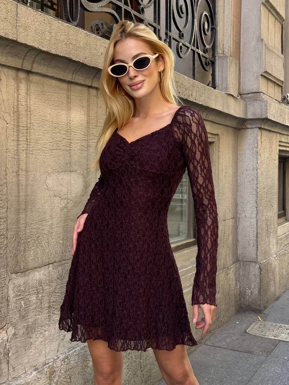 bysoca Kadın Kahverengi Kalp Yaka Uzun Kollu Dantel Mini Elbise, zarafeti ve romantik cazibeyi bir araya getiriyor. Özel günlerinizde tüm dikkatleri üzerinize çekecek bu kahverengi dantel elbise, feminen detaylarıyla göz kamaştırıyor.