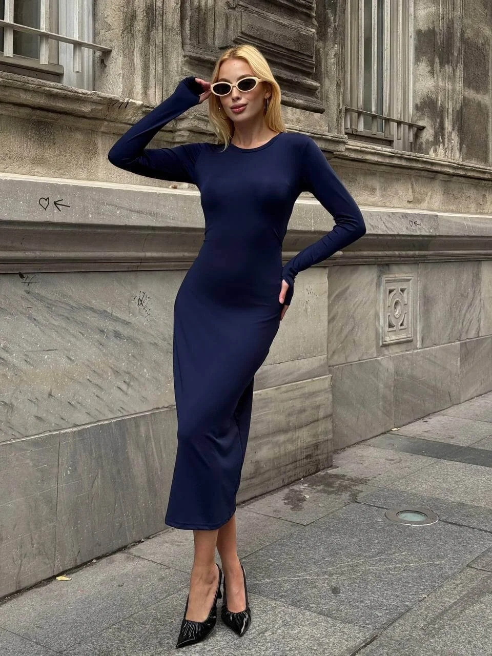 bysoca Kadın Lacivert Bisiklet Yaka Uzun Kollu Vücudu Saran Midi Elbise, modern zarafeti ve konforu bir araya getirerek gardırobunuzun temel parçalarından biri olmaya aday. Sade ve güçlü duruşuyla bu lacivert elbise, vücut hatlarınızı kusursuzca ortaya çıkarır.