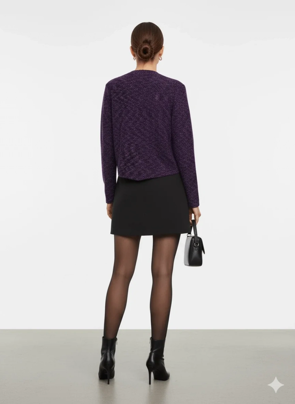 Şık Tüvit Görünümü: Siyah ve mor ipliklerin birleşiminden oluşan melanj rengi, klasik tüvit kumaş dokusunu anımsatarak lüks ve zarif bir görünüm sunar.