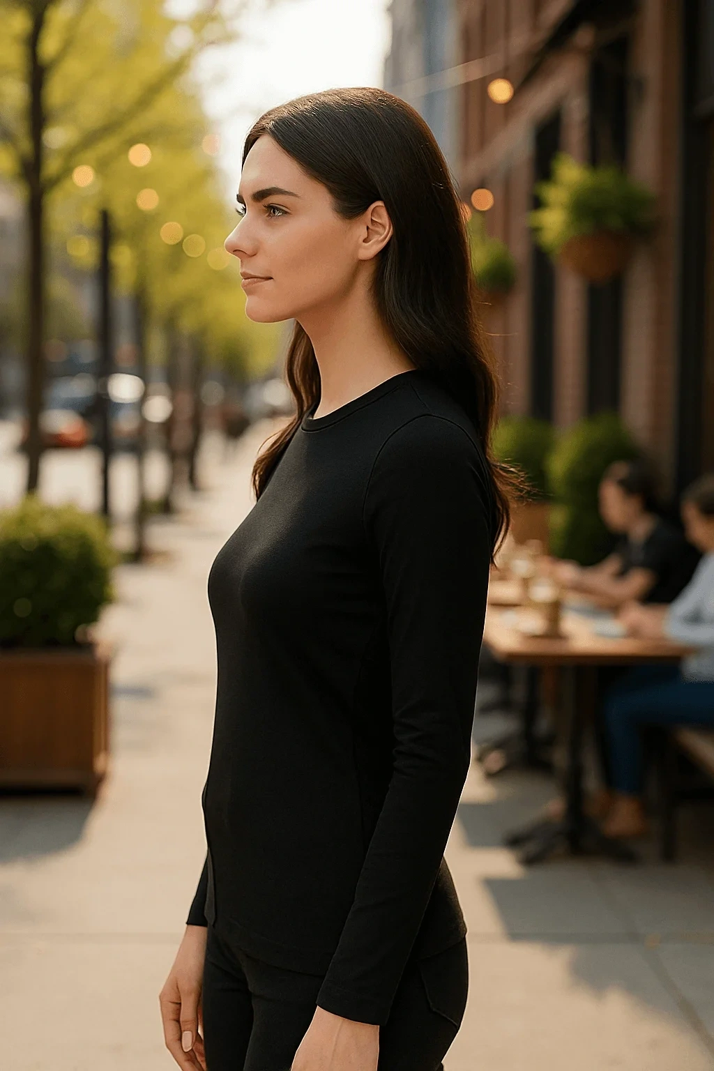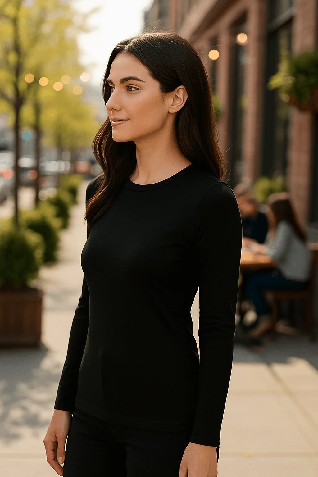 Gardırobunuzun joker parçası olmaya aday bu siyah bisiklet yaka uzun kollu bluz, sonsuz kombinasyon imkanı sunar. Jean pantolonlarla spor, kumaş etekler ve ceketlerle klasik bir ofis stili yaratabilirsiniz. Bu uzun kollu pamuklu basic tişört, hem tek başına hem de yelek veya hırkaların içinde konforlu ve şık bir katman olarak vazgeçilmeziniz olacak.