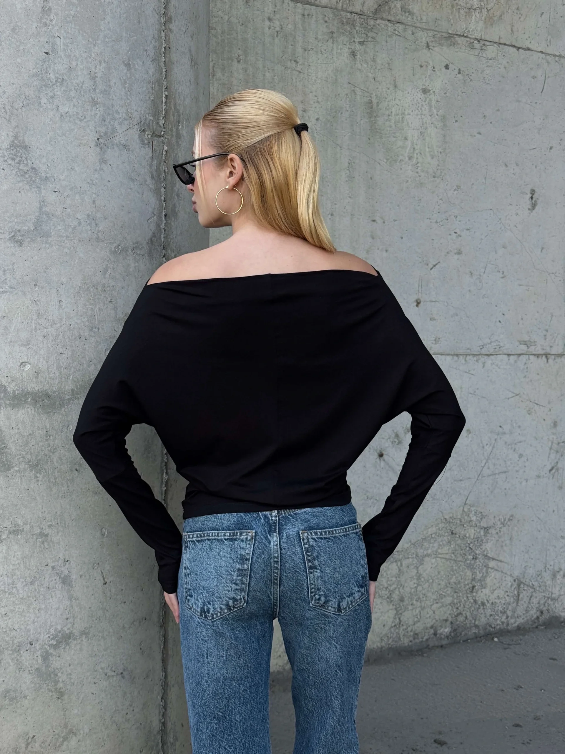 bysoca Kadın Siyah Kayık Yaka Tek Omuz Dekolteli Uzun Kollu Bluz, zarafeti ve modern tasarımı bir araya getiriyor. Tek omuz detayıyla dikkat çeken bu siyah bluz, hem günlük hem de özel anlarınızda stilinize iddialı bir dokunuş katacak.