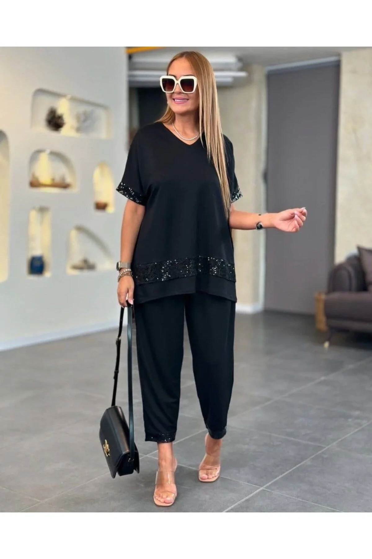 Işıltılı Payet Detayları: Tuniğin kol ve etek uçları ile pantolonun paçalarında yer alan siyah payet şeritler, takıma zarif ve göz alıcı bir ışıltı katıyor.