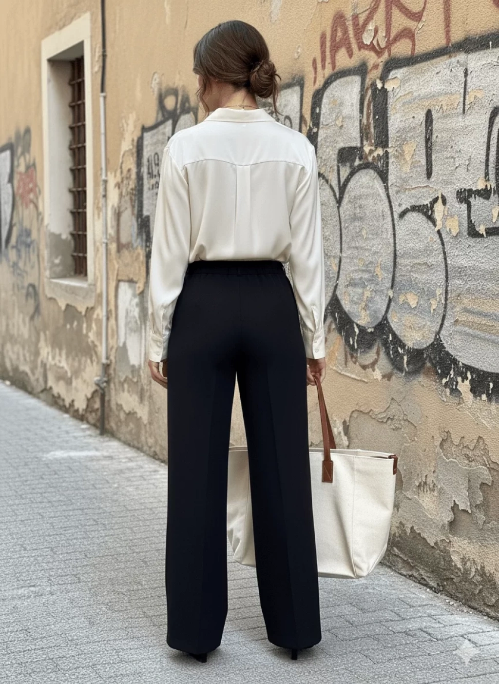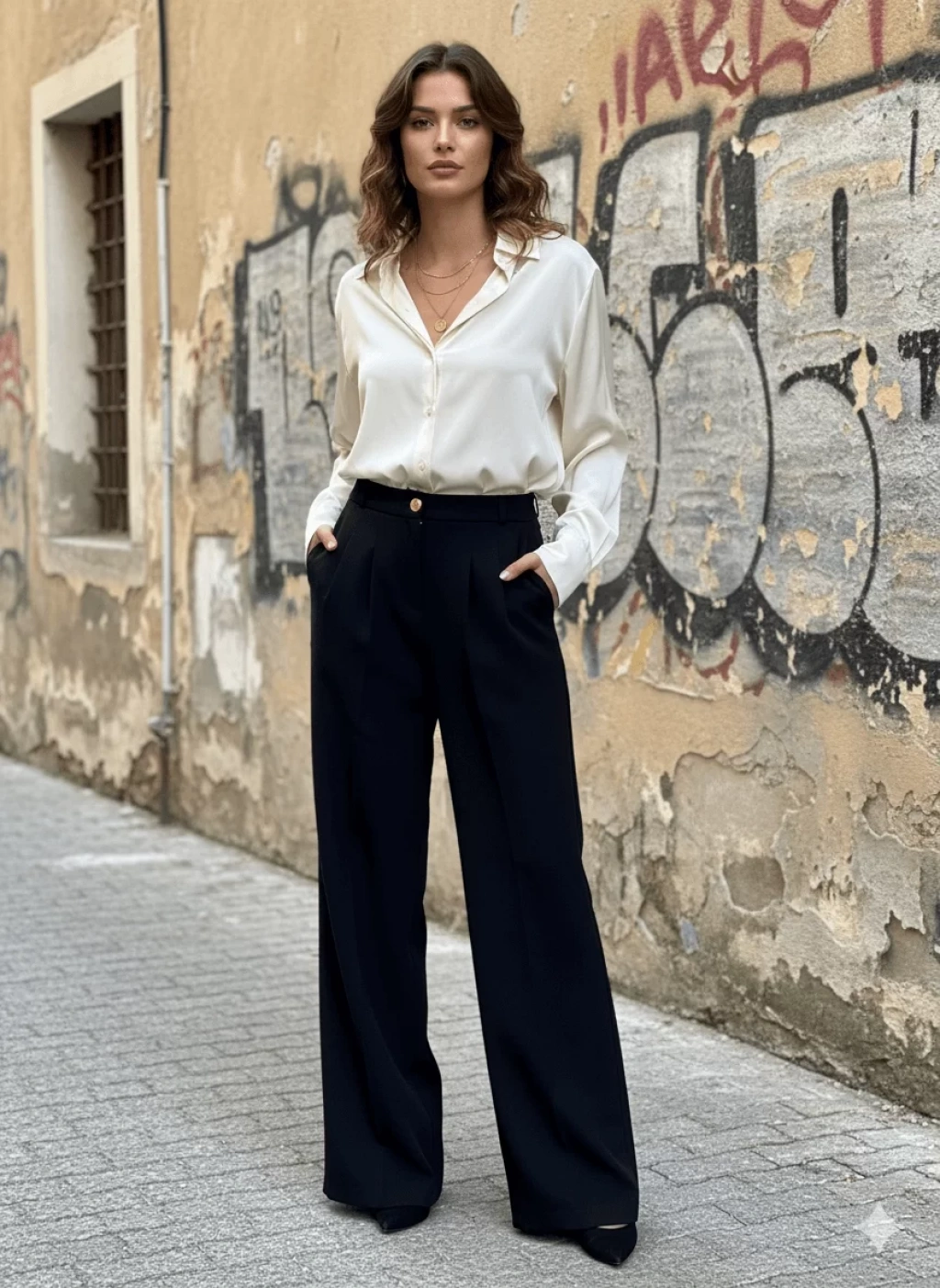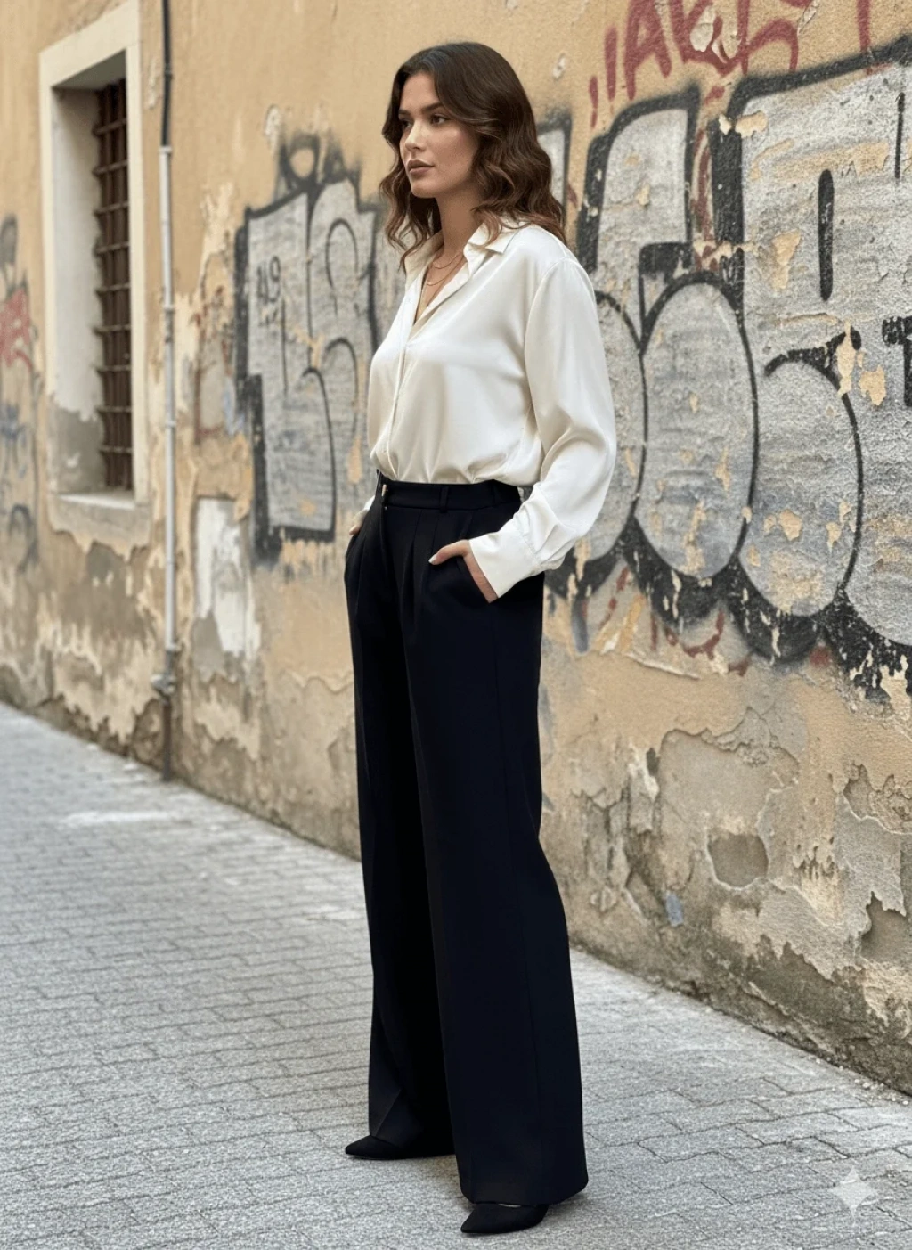 Zarif Palazzo Paça: Dizden aşağı doğru genişleyen bol paça (palazzo) kesimi, hem hareket özgürlüğü sağlar hem de bacak boyunu daha uzun gösterir.