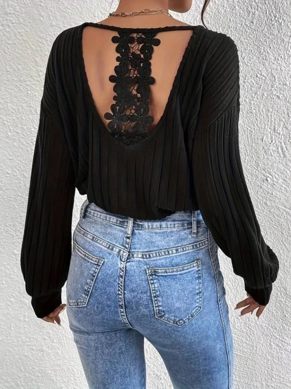 Bu sırtı dantelli bluz, yüksek bel jean'ler veya deri pantolonlarla kombinlendiğinde tüm dikkatleri üzerinize çekecektir. Saçlarınızı toplayarak veya yandan ayırarak bluzun sırt detayını ön plana çıkarabilirsiniz. Hem gündüz şıklığı hem de akşam yemeği için ideal bir seçimdir.