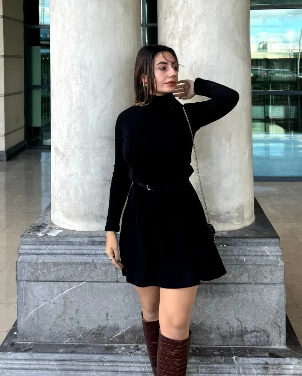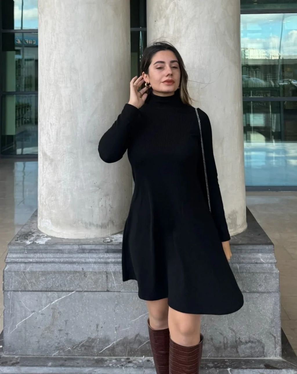 Bu balıkçı yaka triko elbise, zahmetsiz bir kış şıklığı sunar. Uzun çizmelerle kombinleyerek modern ve stil sahibi bir görünüm elde edebilir, beline takacağınız bir kemerle silüetinizi daha da vurgulayabilirsiniz. Tek parça ile hem sıcak kalıp hem de şık görünmek için idealdir.