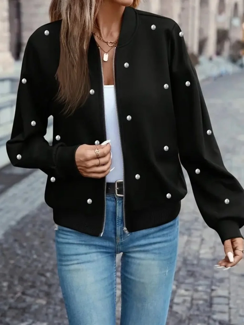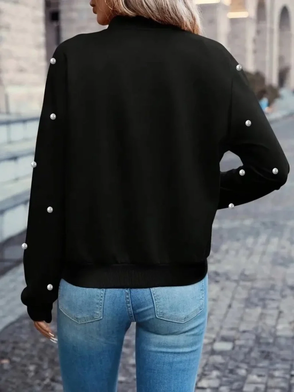 Zarif İnci Süslemeleri: Ceketin gövde ve kollarına serpiştirilmiş inci detayları, sportif bomber tasarıma lüks ve feminen bir dokunuş katar.