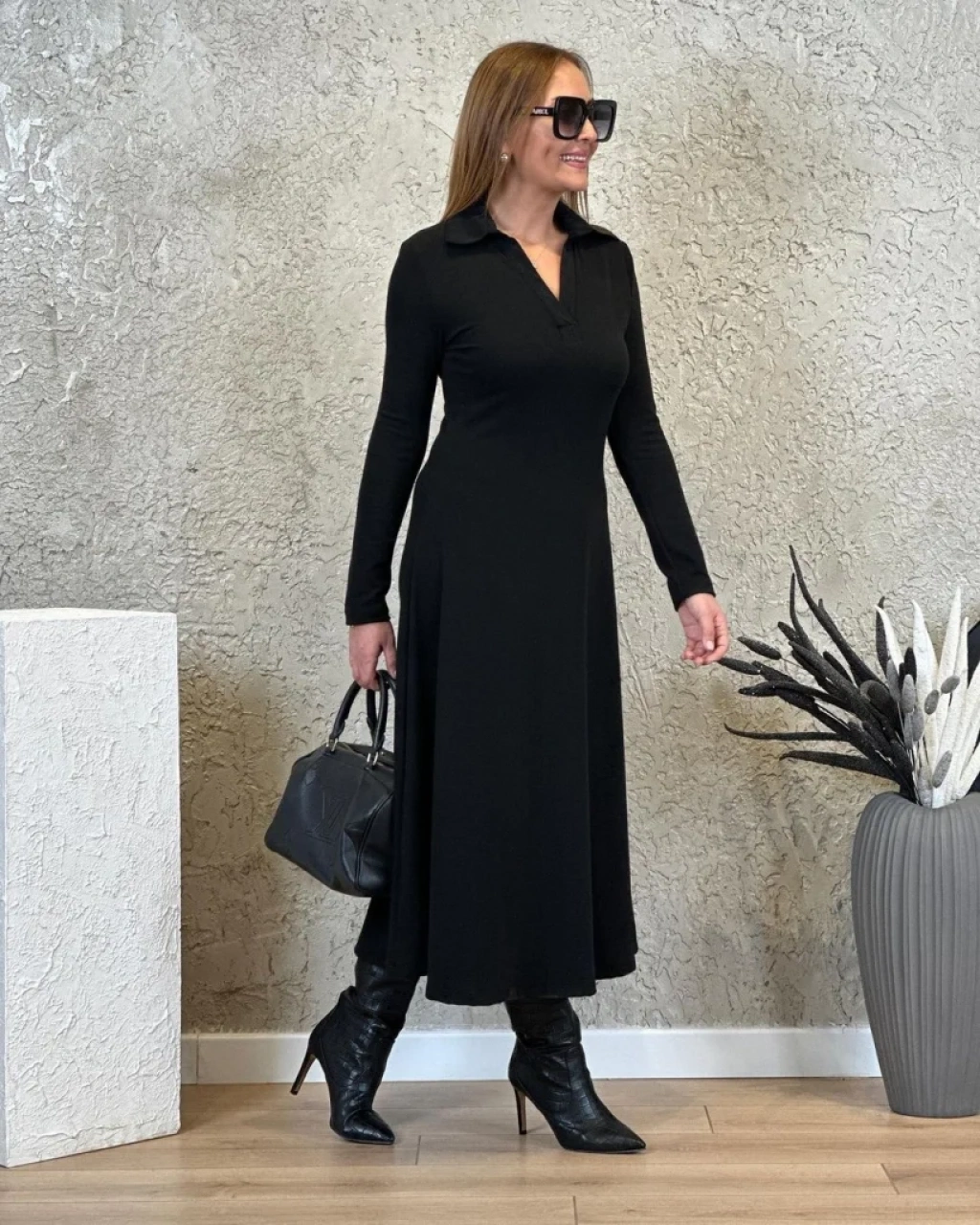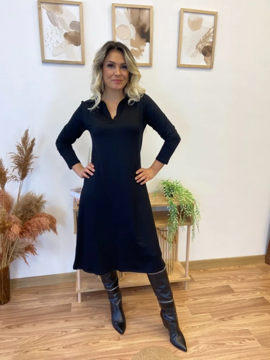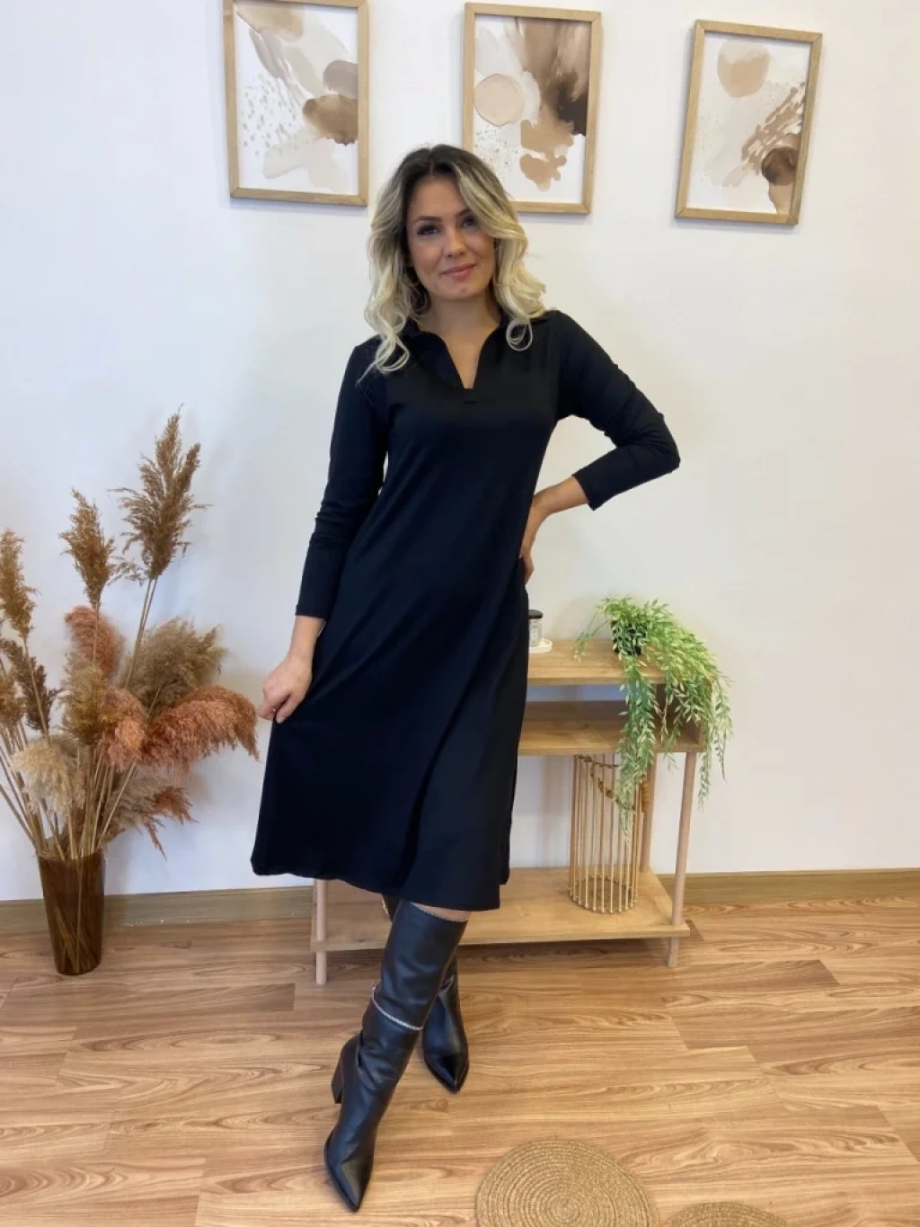 Bu siyah midi elbise, çok yönlü stiliyle öne çıkar. Uzun çizmeler ve bir deri ceketle modern ve havalı bir sonbahar kombini, spor ayakkabılarla ise rahat ve dinamik bir günlük görünüm elde edebilirsiniz. Tek parça ile zahmetsiz şıklık sunar.
