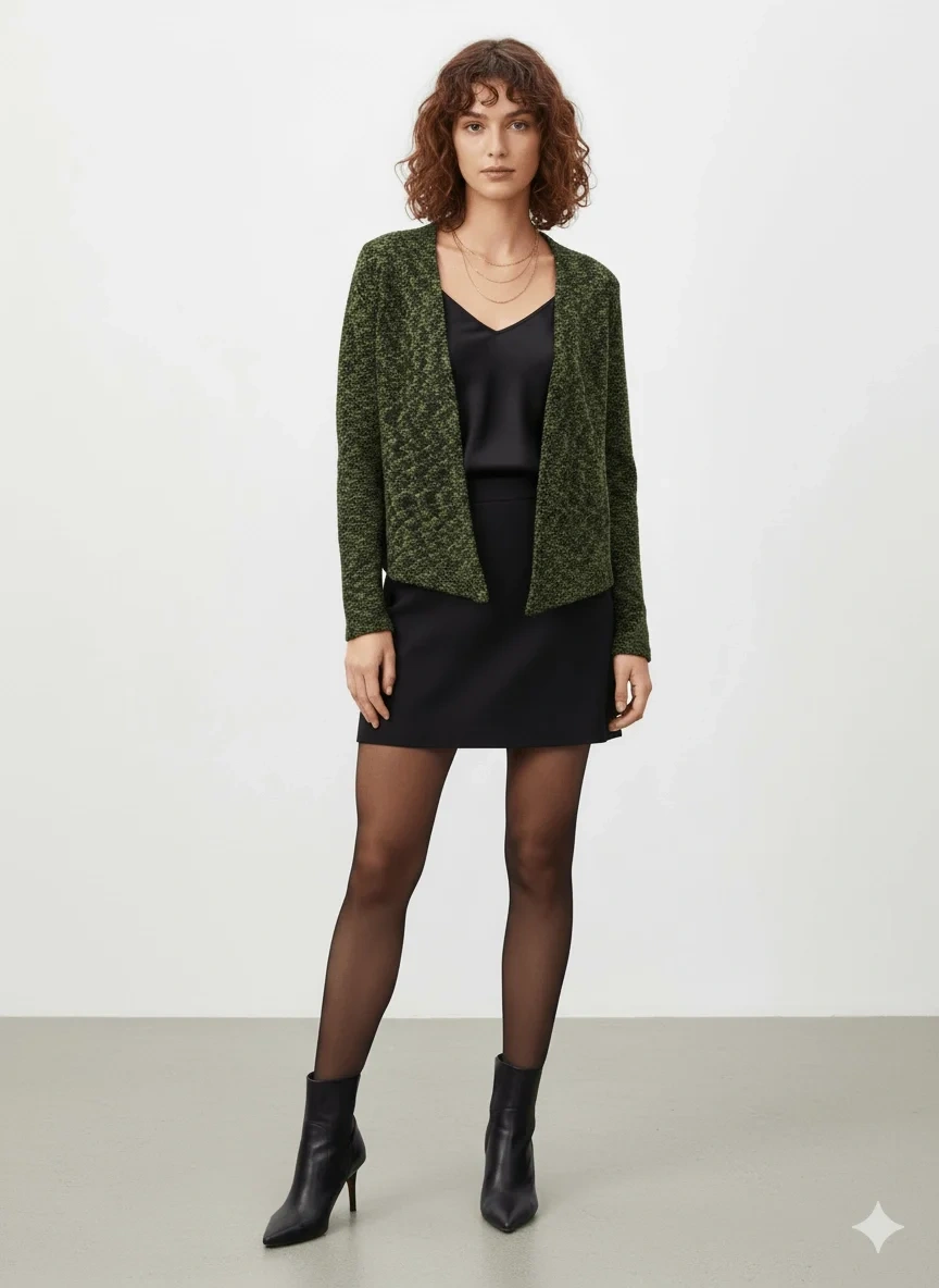 Şık Dokulu Görünüm: Siyah ve yeşil ipliklerin birleşiminden oluşan melanj dokusu, klasik ve zarif bir görünüm sunar.