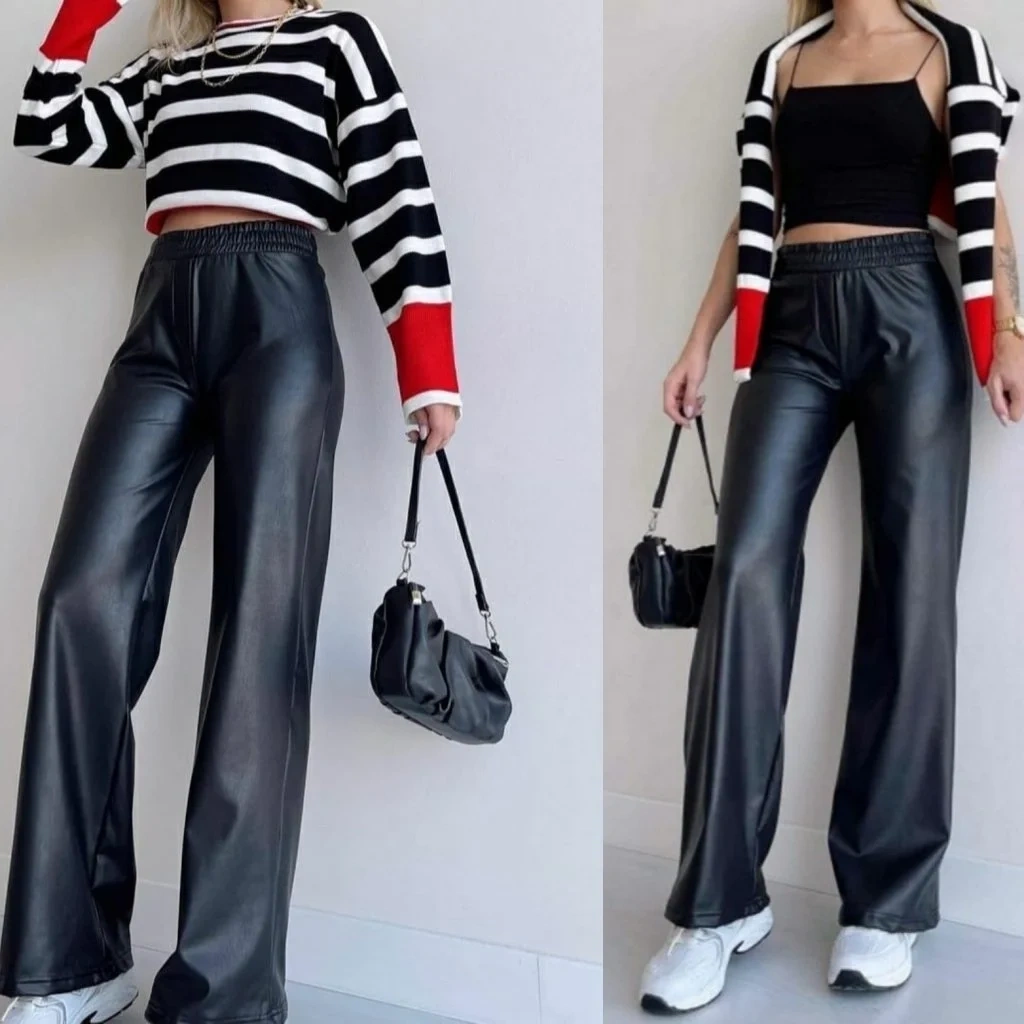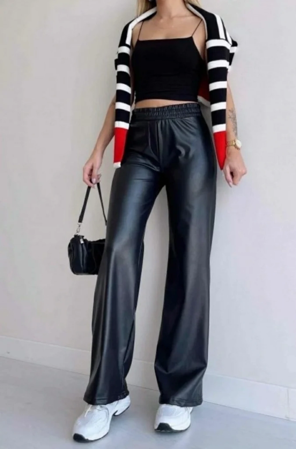 Bu geniş paçalı deri pantolon, crop kazaklar, büstiyerler veya basic tişörtlerle mükemmel bir uyum sağlar. Spor ayakkabılarla tamamlayarak rahat ve havalı bir günlük stil, topuklu ayakkabılarla ise iddialı bir akşam kombini yaratabilirsiniz.