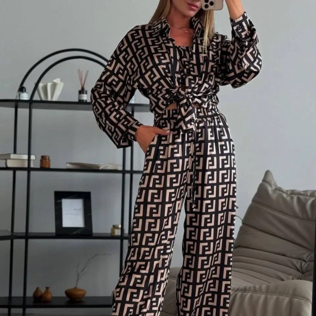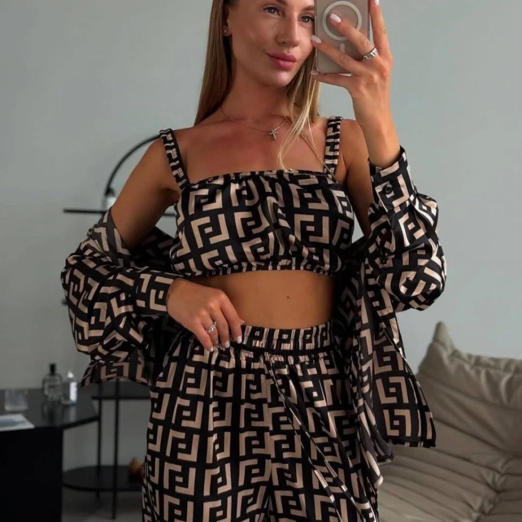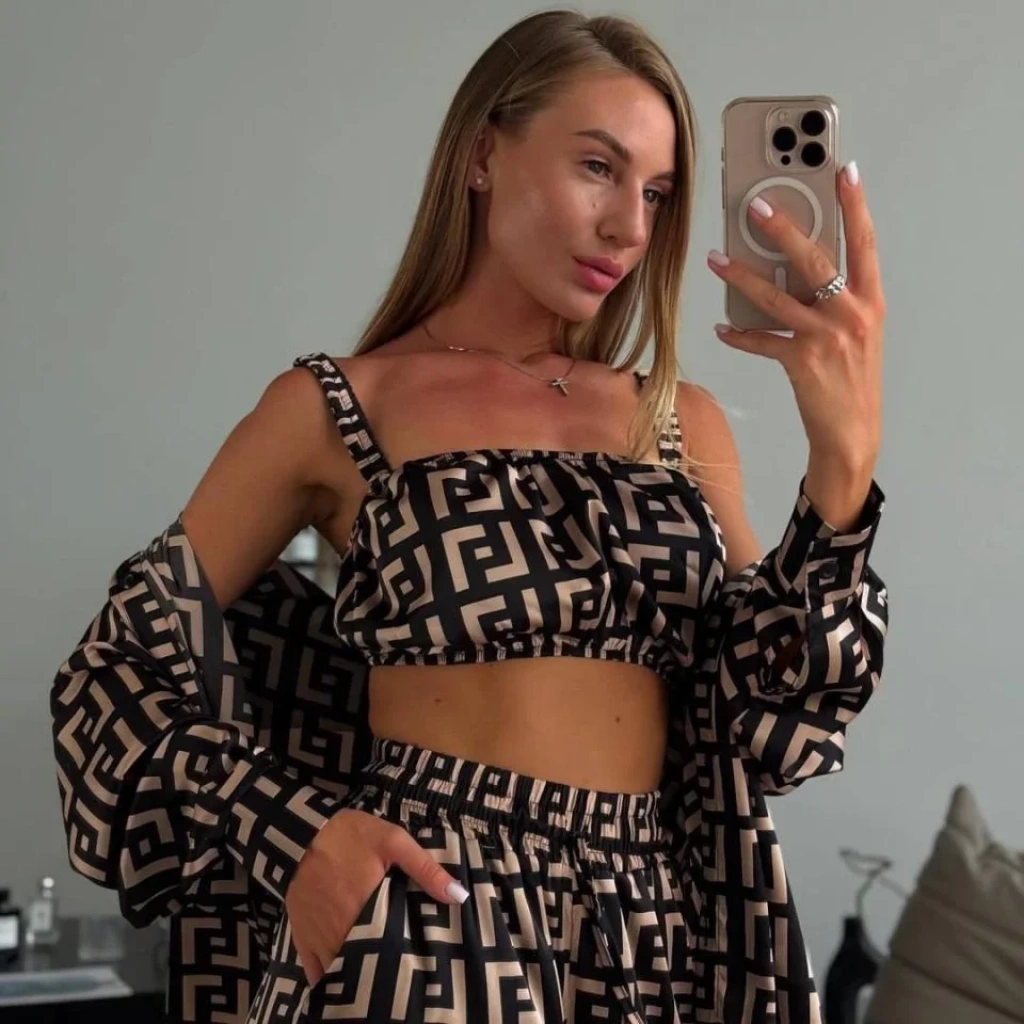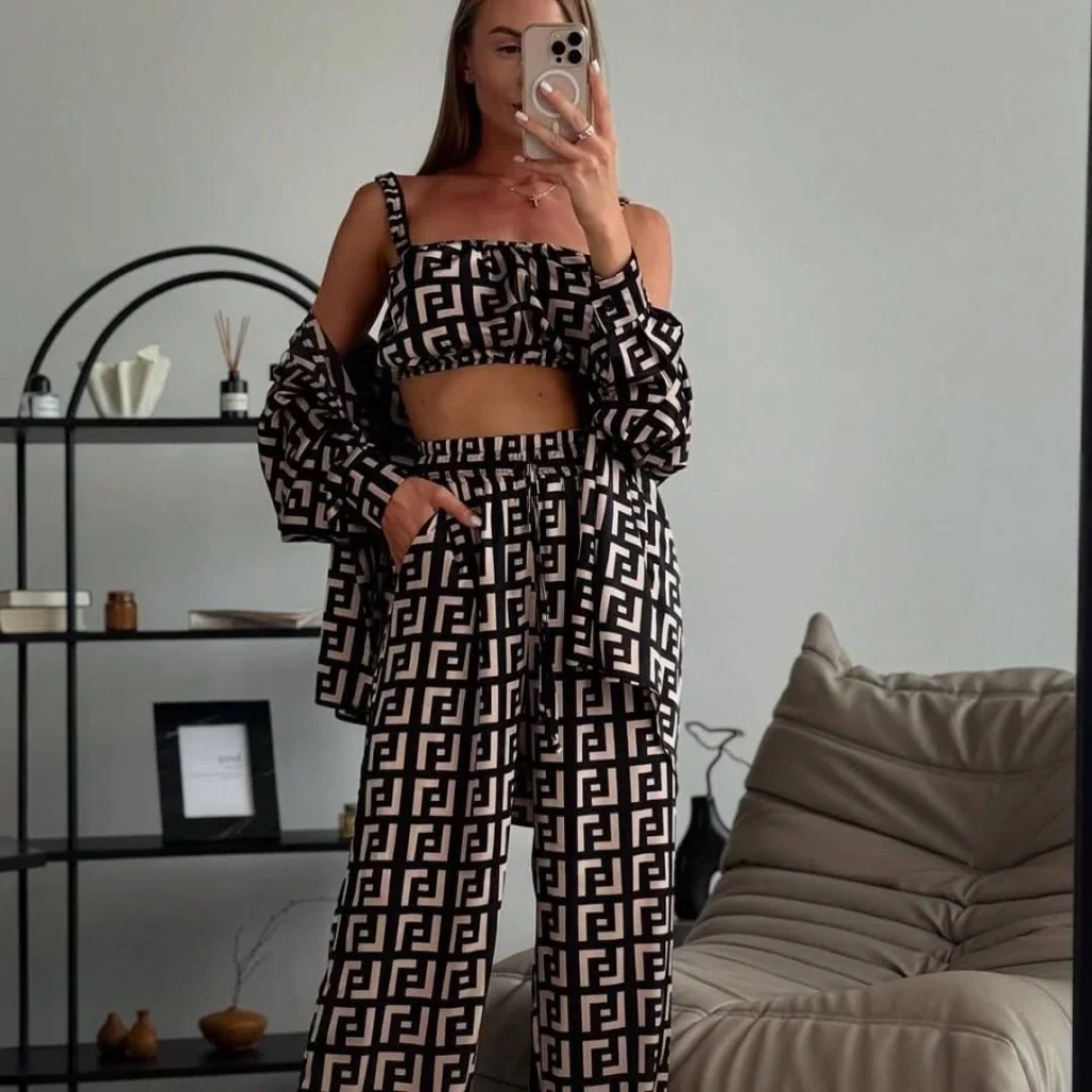 Kadın Bağcık Detaylı Dıjıtal Baskılı Dalgıç Kumaş 3;lü Takım