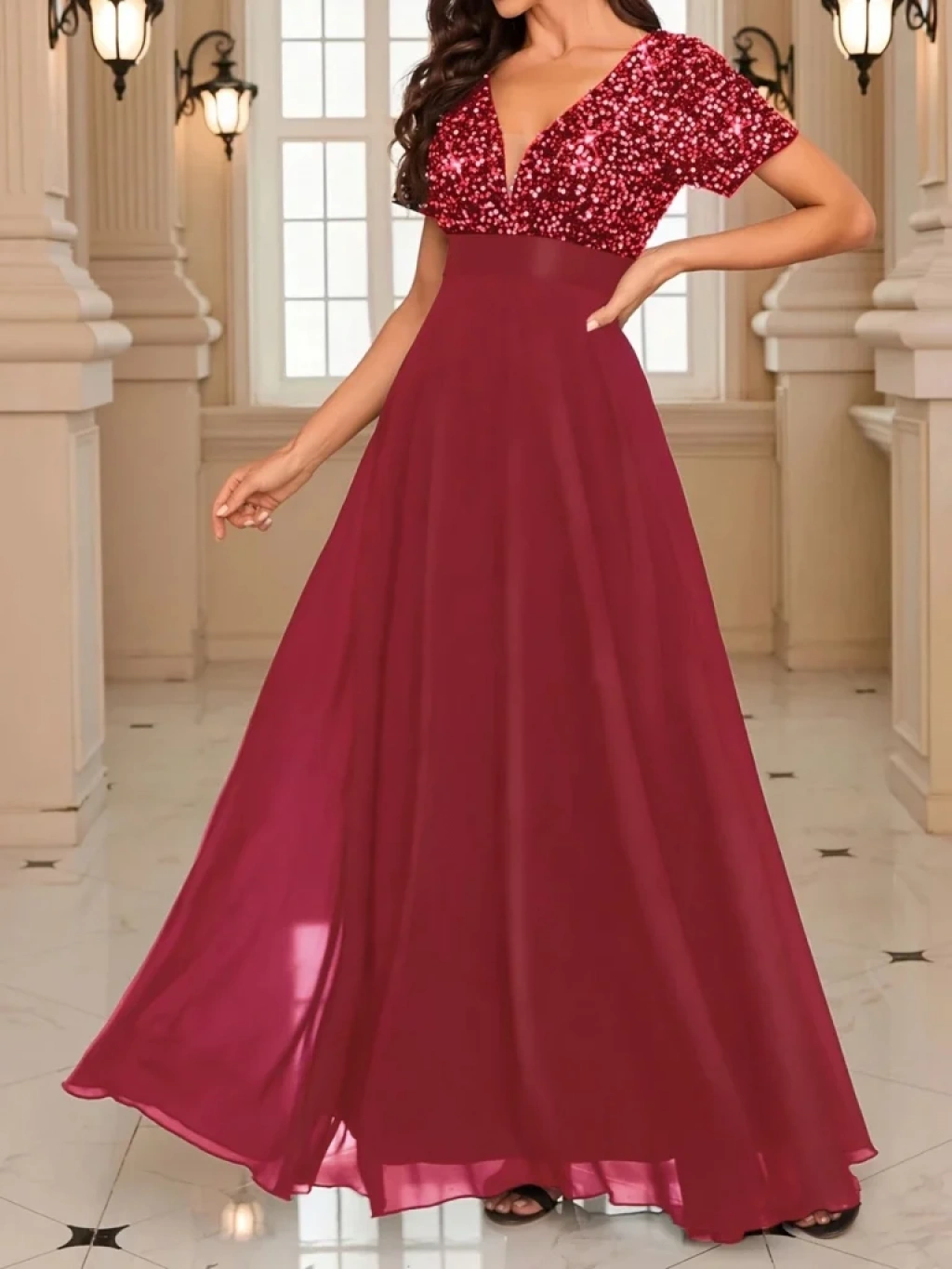 Kadın Kısa Kollu Derin V Yakalı A Kesim Pulpayet Detaylı şifon Nedime Elbisesi