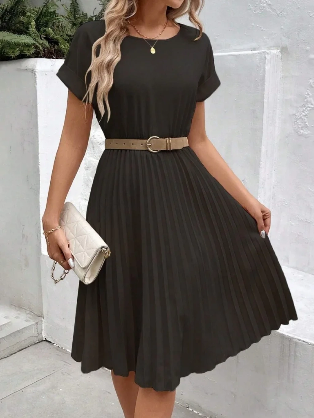 bysoca Kadın Bisiklet Yaka Kısa Kol Beli Lastikli Eteği Piliseli Krep Kumaş Midi Elbise - Siyah