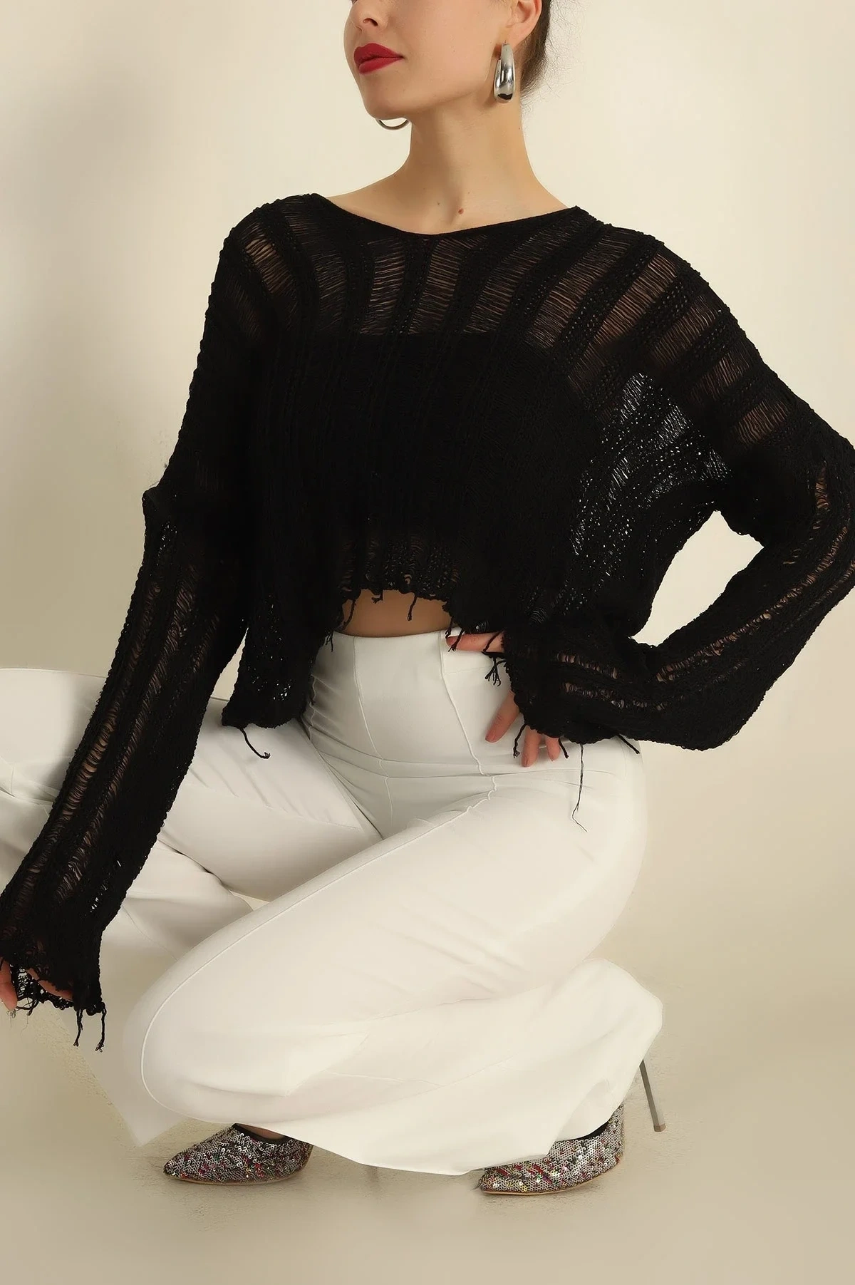 Bu siyah ajurlu triko bluz, "bohem lüks" tarzını en iyi yansıtan parçalardan biridir. Görseldeki gibi yüksek bel siyah pantolonlar ve gümüş aksesuarlarla eşleştirerek modern bir şehir stili yakalayabilir; içerisine ten rengi bir büstiyer giyerek ajur detaylarını vurgulayabilirsiniz. Yaz tatillerinde şortlar ve sandaletlerle, akşam etkinliklerinde ise deri eteklerle kombinleyerek Pinterest estetiğini doğrudan stilinize yansıtın.