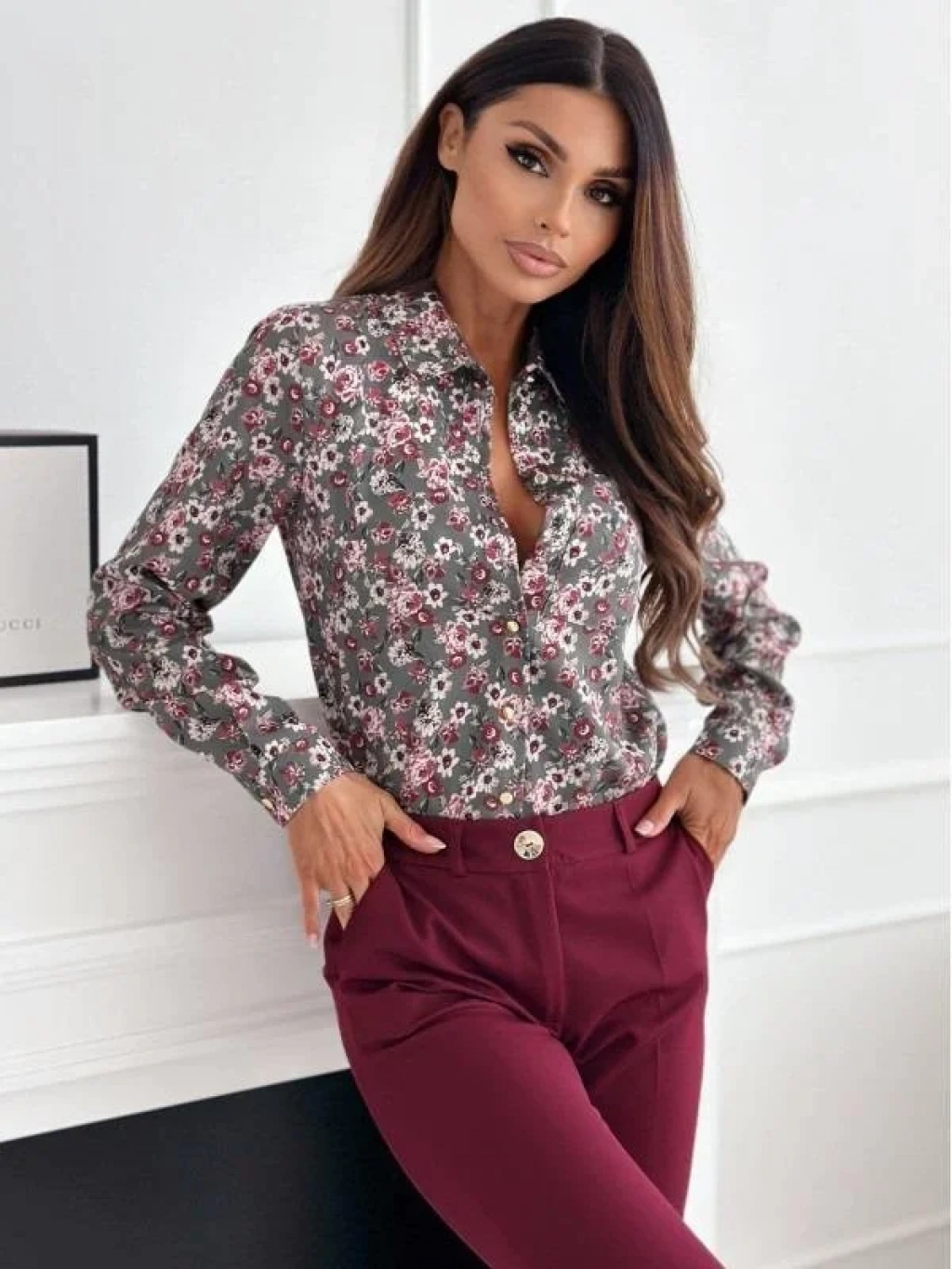 Kadın Uzun Kol Cep Detay çiçek Baskılı Mosskrep Kumaş Gömlek