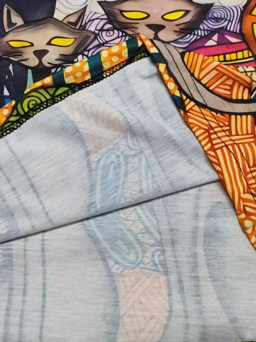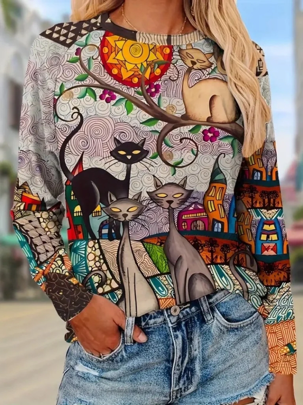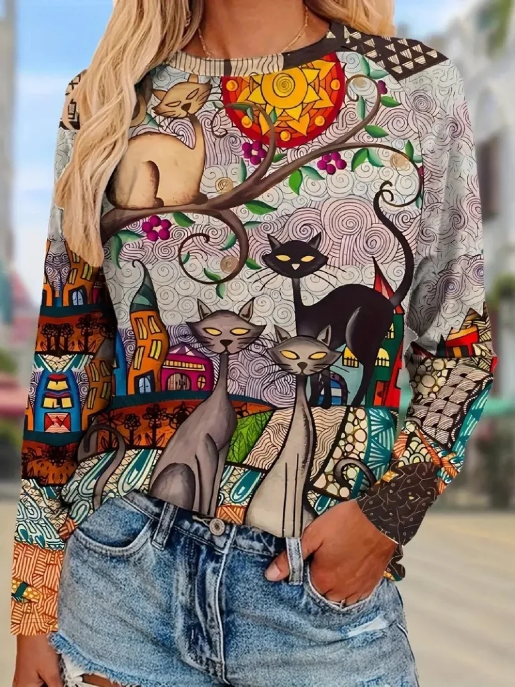Kadın Uzun Kollu Bisiklet Yaka Kedi Baskılı Süprem Bluz