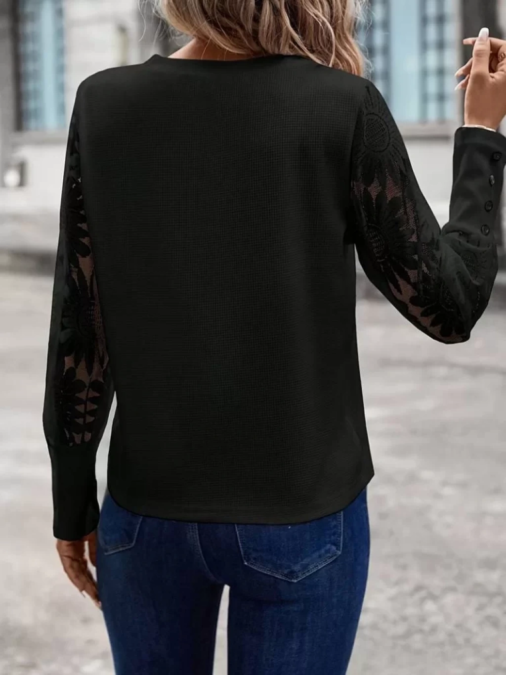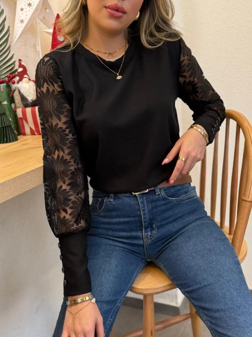 bysoca Kadın Bisiklet Yaka Kolları Dantel Balon Kol Manşeti Düğmeli Waffle Kumaş Bluz - Siyah