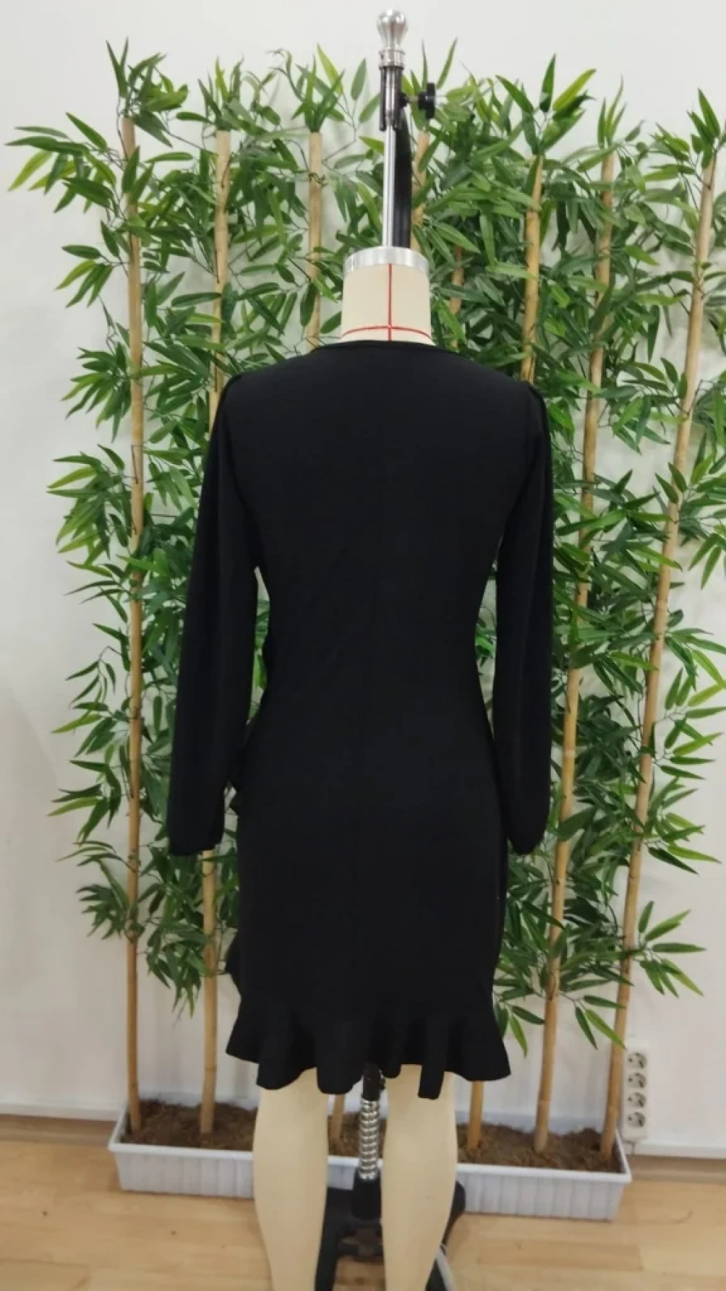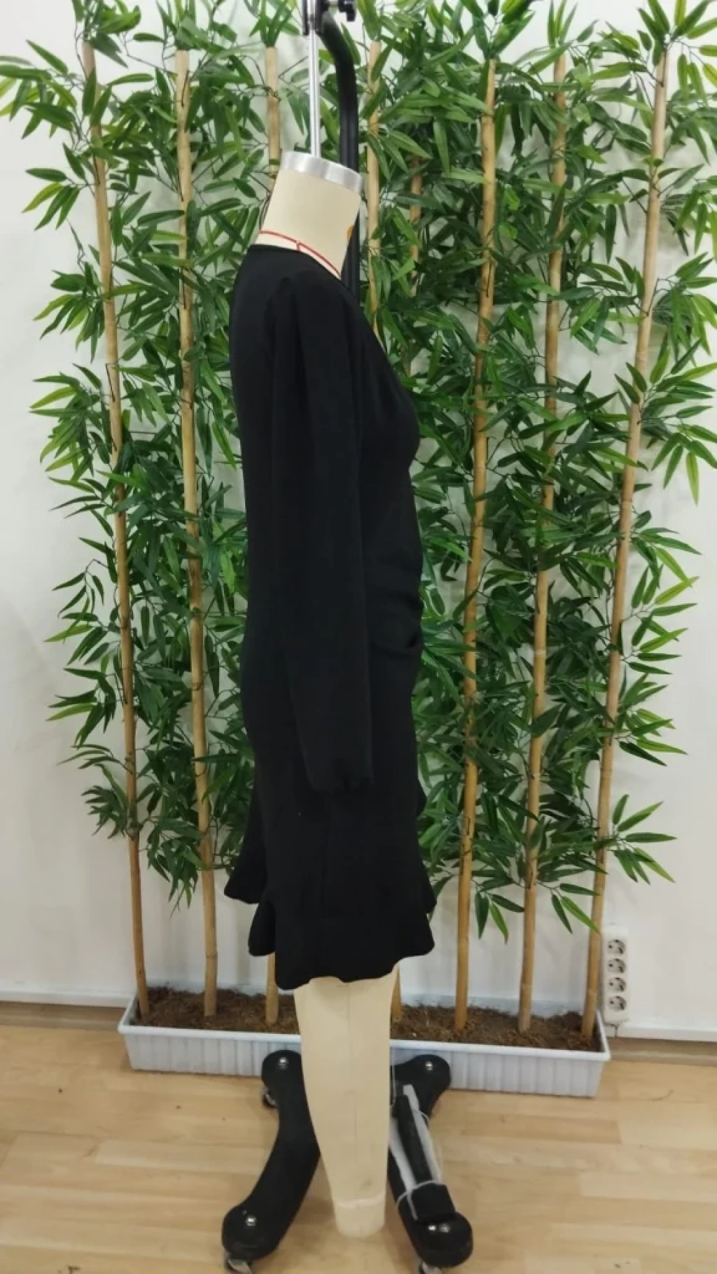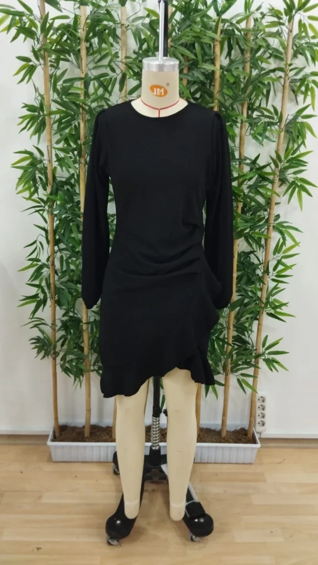 bysoca Kadın Bisiklet Yaka Uzun Balon Kollu Drapeli Eteği Fırfırlı Anvelop Mini Elbise - Siyah
