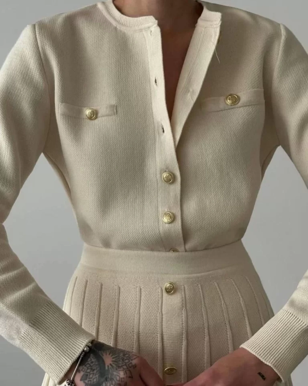 Kadın Uzun Kollu Gold Düğme Detay Yelek Ve Pileli Mini Etek Ikili Takım
