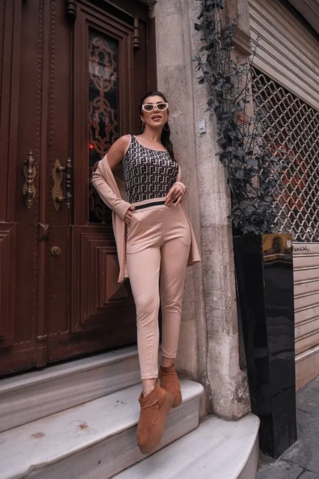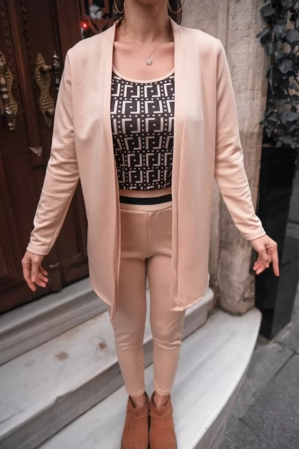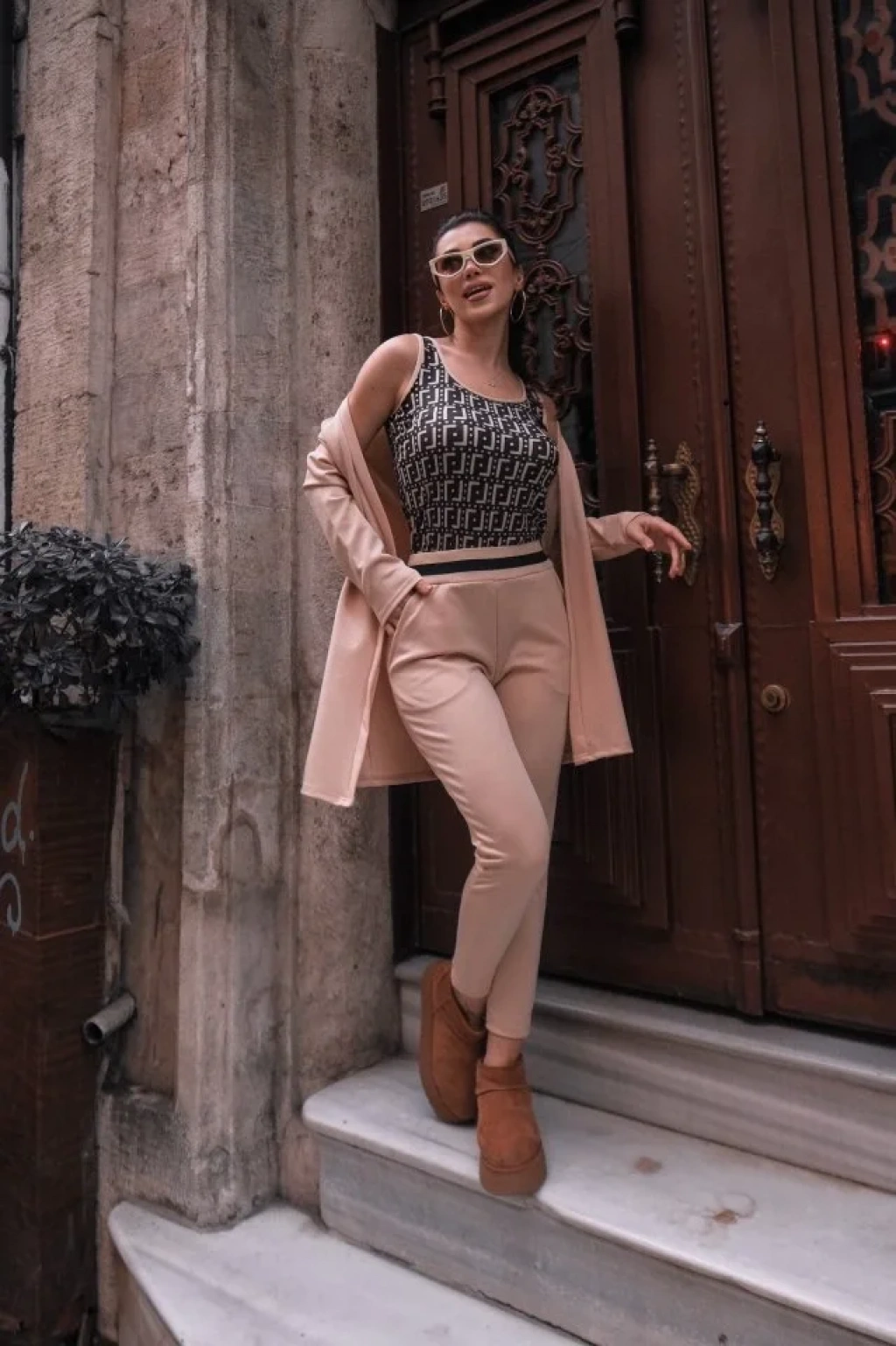 bysoca Kadın Desenli Büstiyer Yüksek Bel Pantolon ve Uzun Kollu Hırka Krep Üçlü Takım - Bej