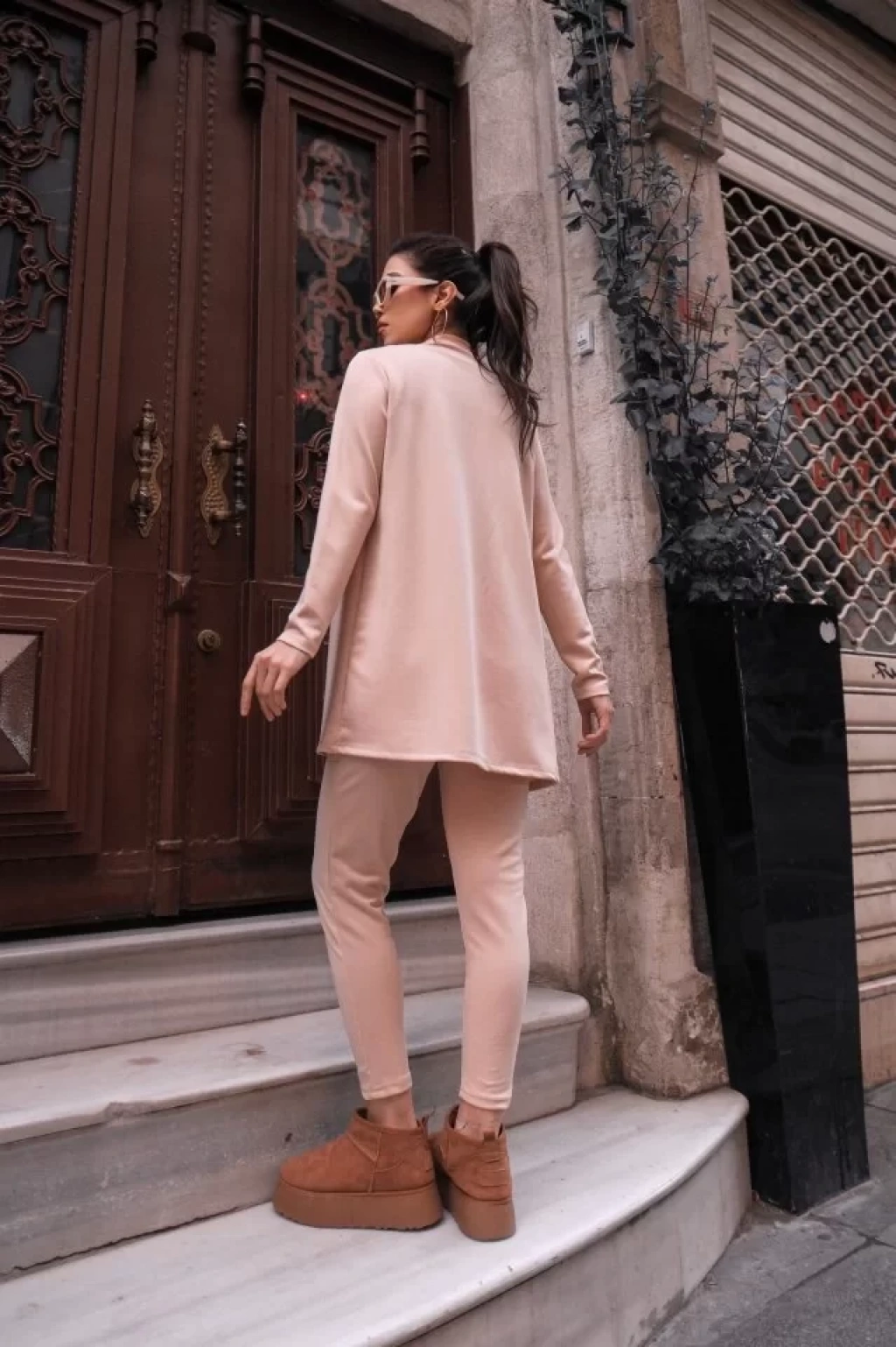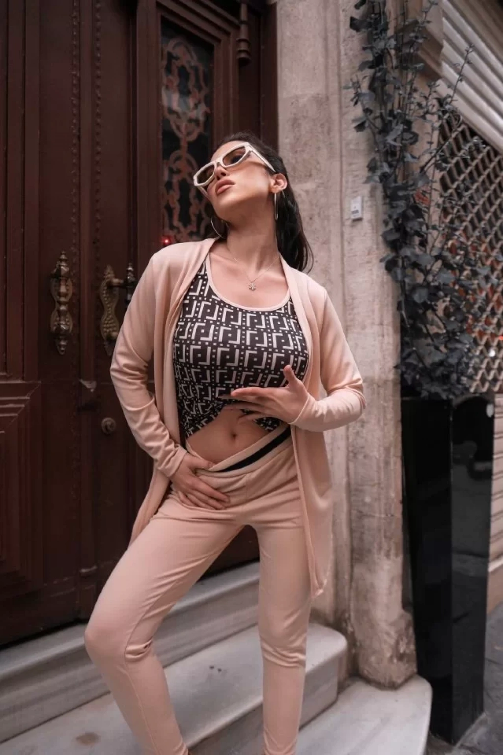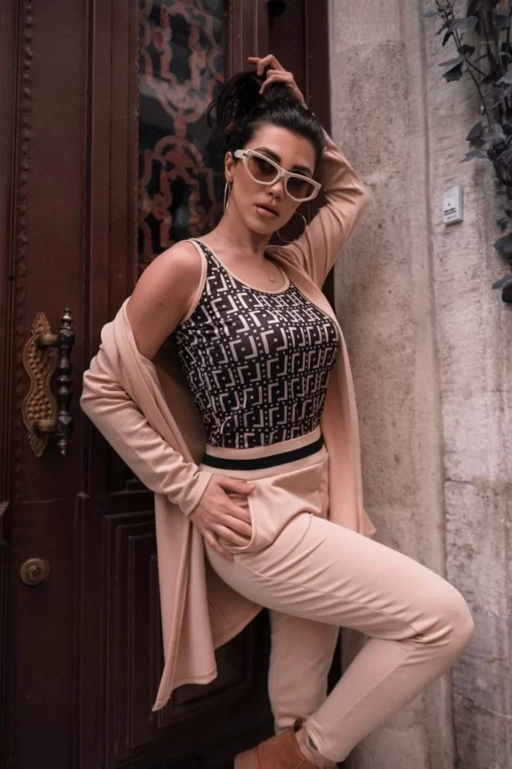 bysoca Kadın Desenli Büstiyer Yüksek Bel Pantolon ve Uzun Kollu Hırka Krep Üçlü Takım - Bej