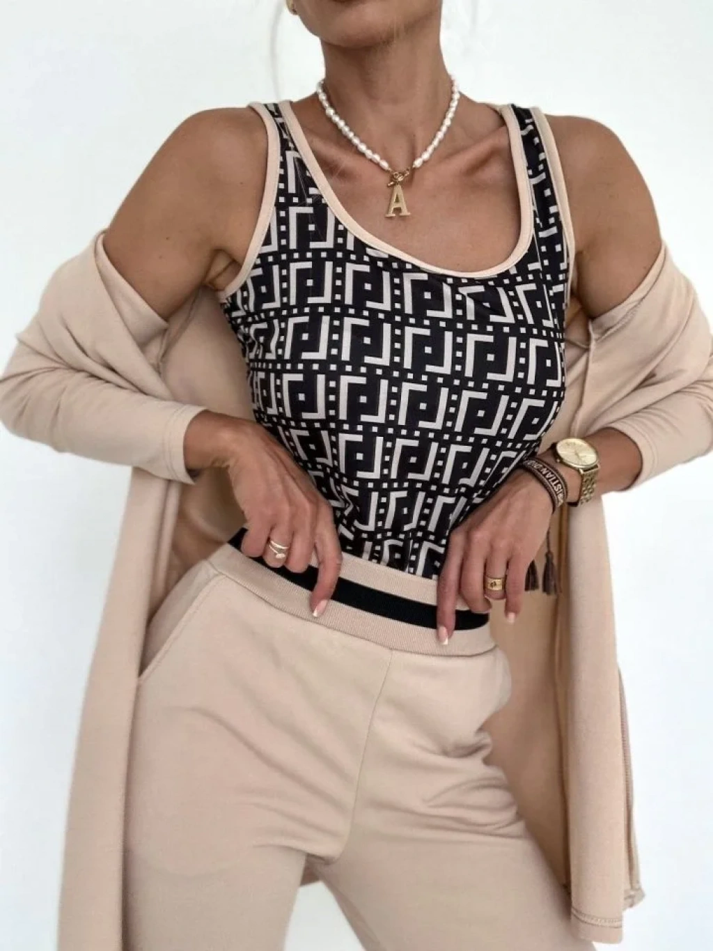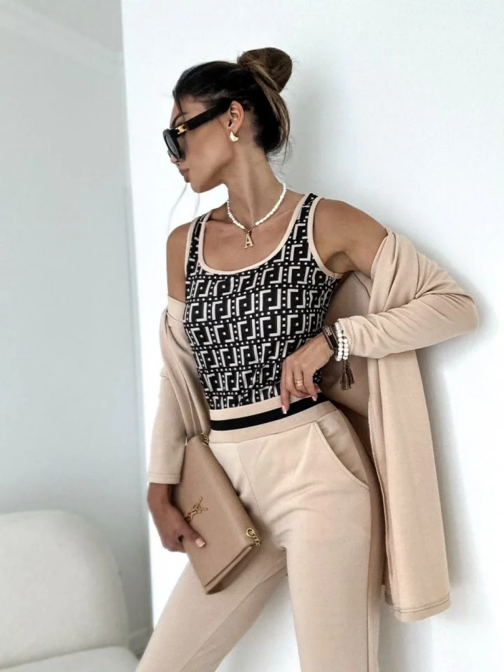 bysoca Kadın Desenli Büstiyer Yüksek Bel Pantolon ve Uzun Kollu Hırka Krep Üçlü Takım - Bej