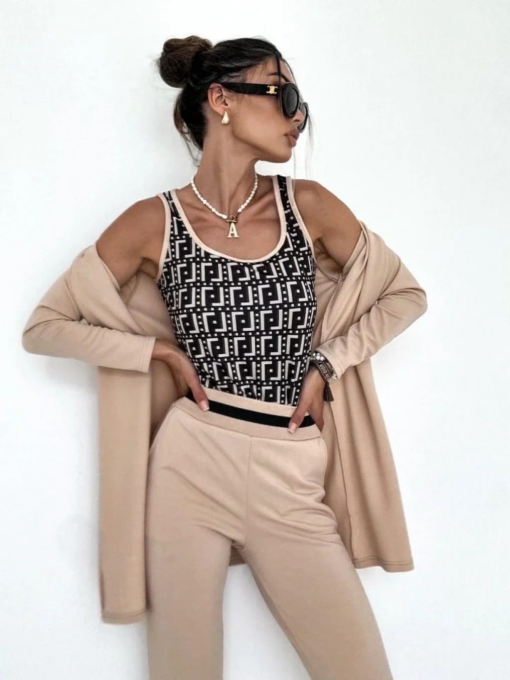 bysoca Kadın Desenli Büstiyer Yüksek Bel Pantolon ve Uzun Kollu Hırka Krep Üçlü Takım - Bej