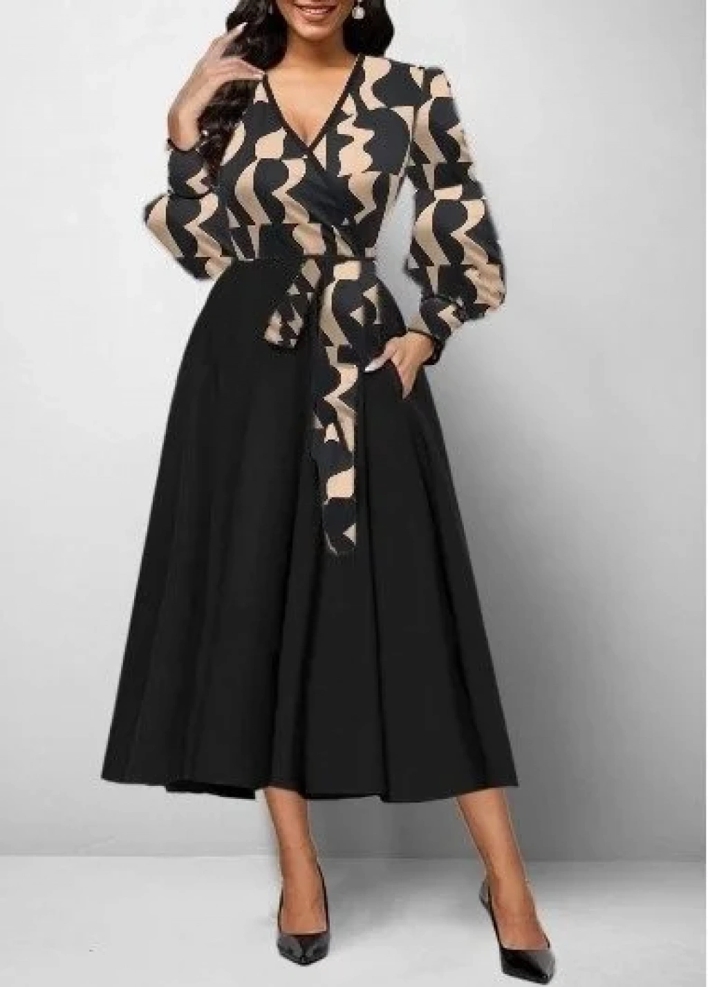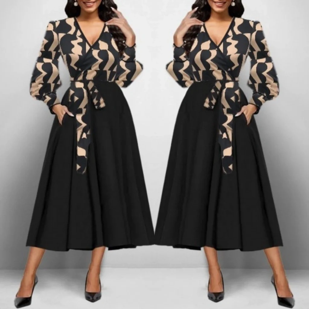 bysoca Kadın Kruvaze Yaka Üstü Desenli Uzun Balon Kollu Kloş Etekli Midi Boy Elbise - Siyah