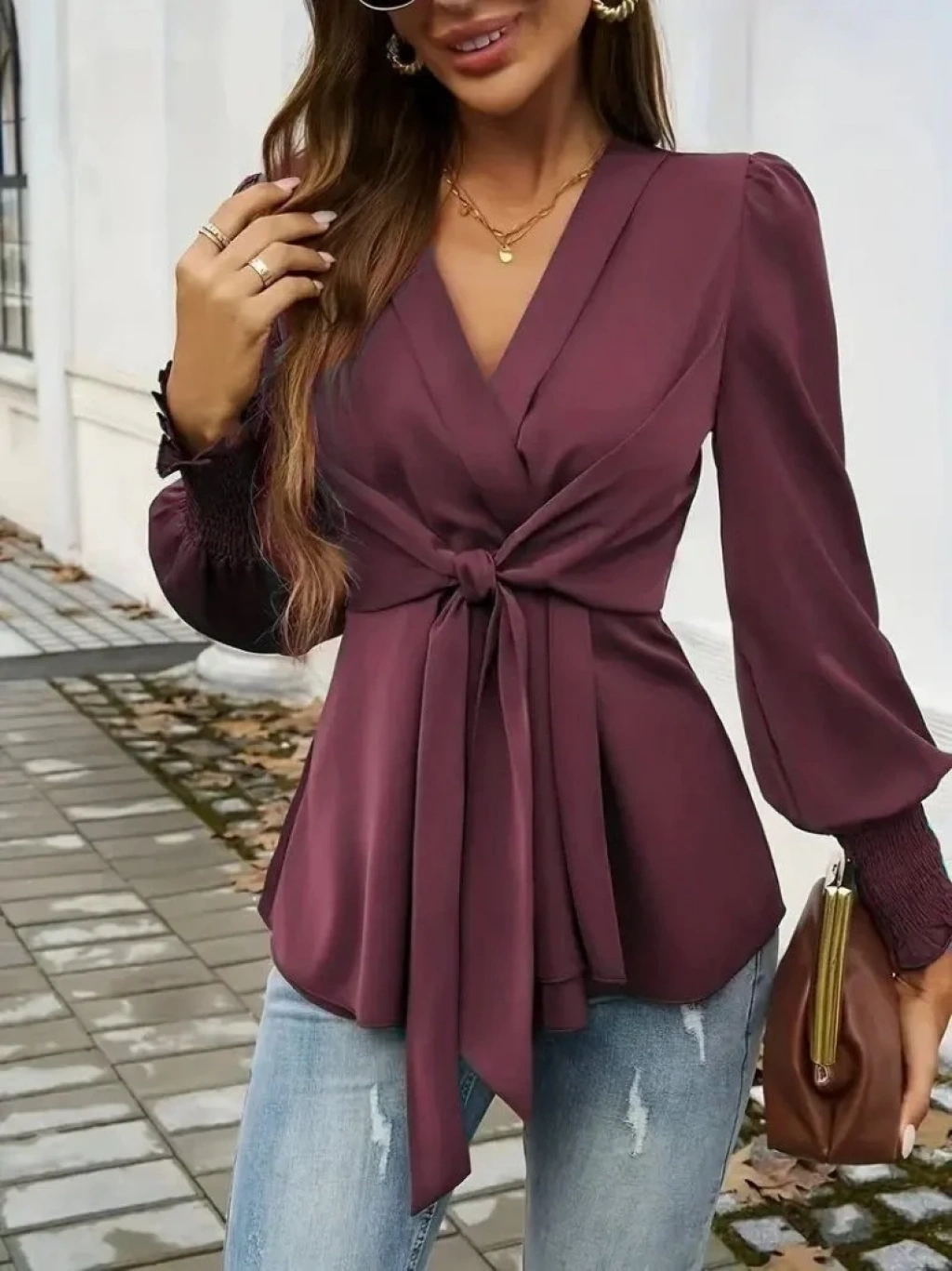 Kadın Uzun Kollu Kruvaze Yakalı önden Bağlamalı Ithal Krep Bluz
