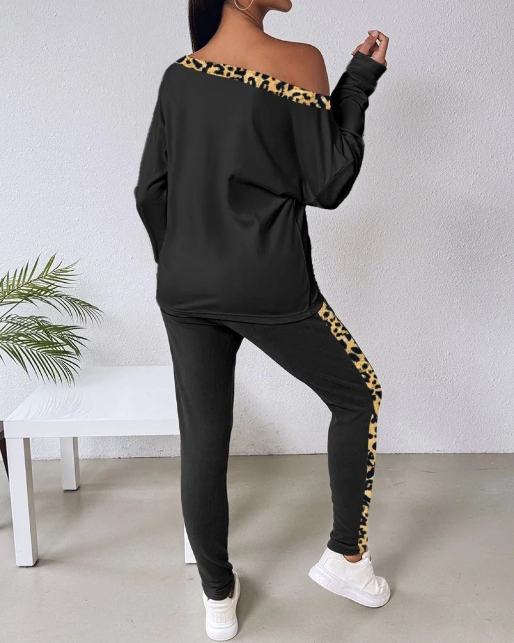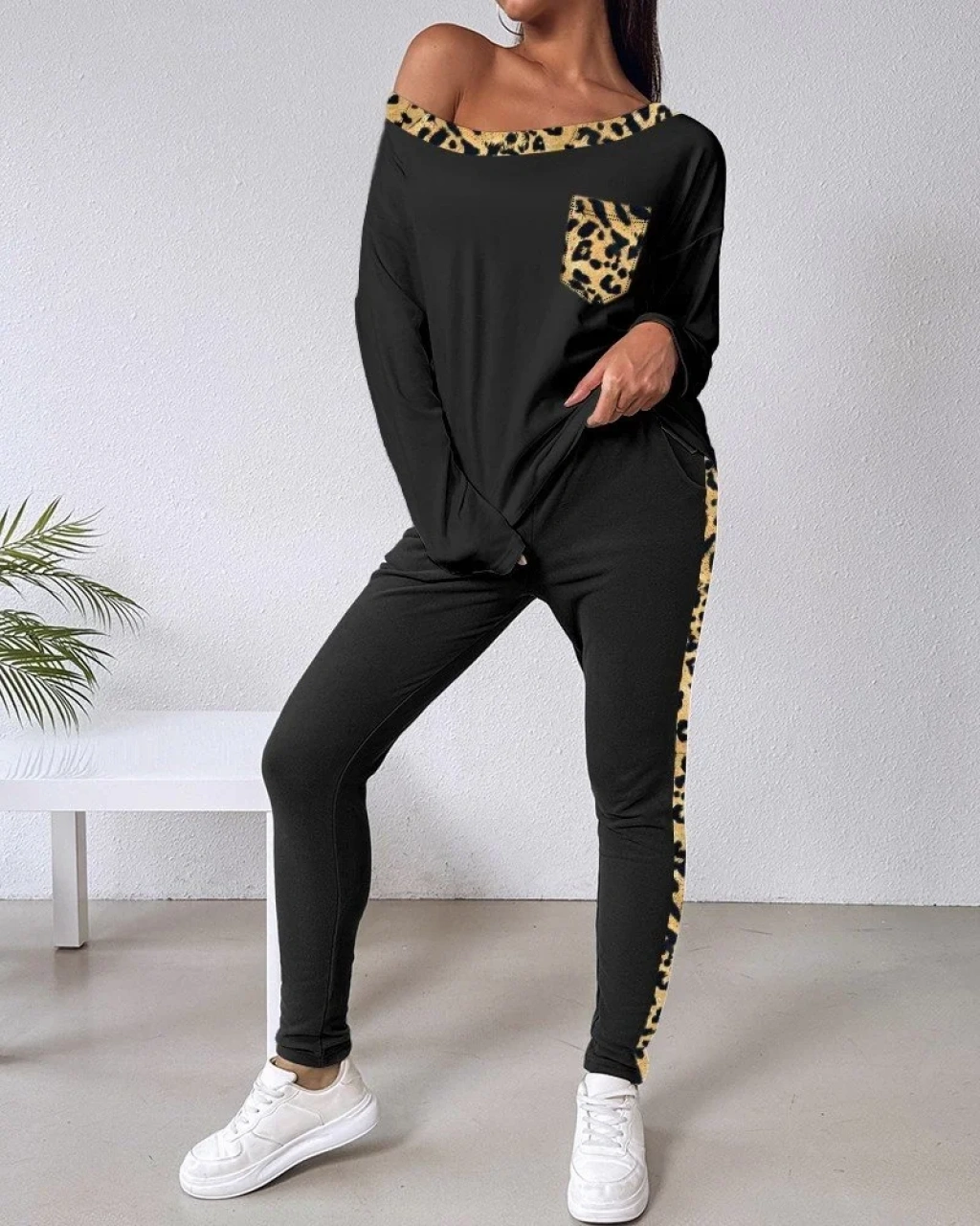 bysoca Kadın Kayık Yaka Leopar Desenli Düşük Omuzlu Sweatshirt ve Jogger Eşofman İkili Takım - Siyah