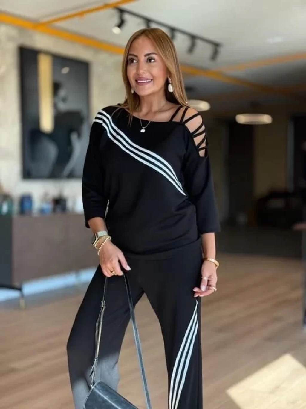 Kadın Uzun Kollu Omuz Dekolteli çapraz Ribana Detay Bluz Ve Pantolon Ikili Takım