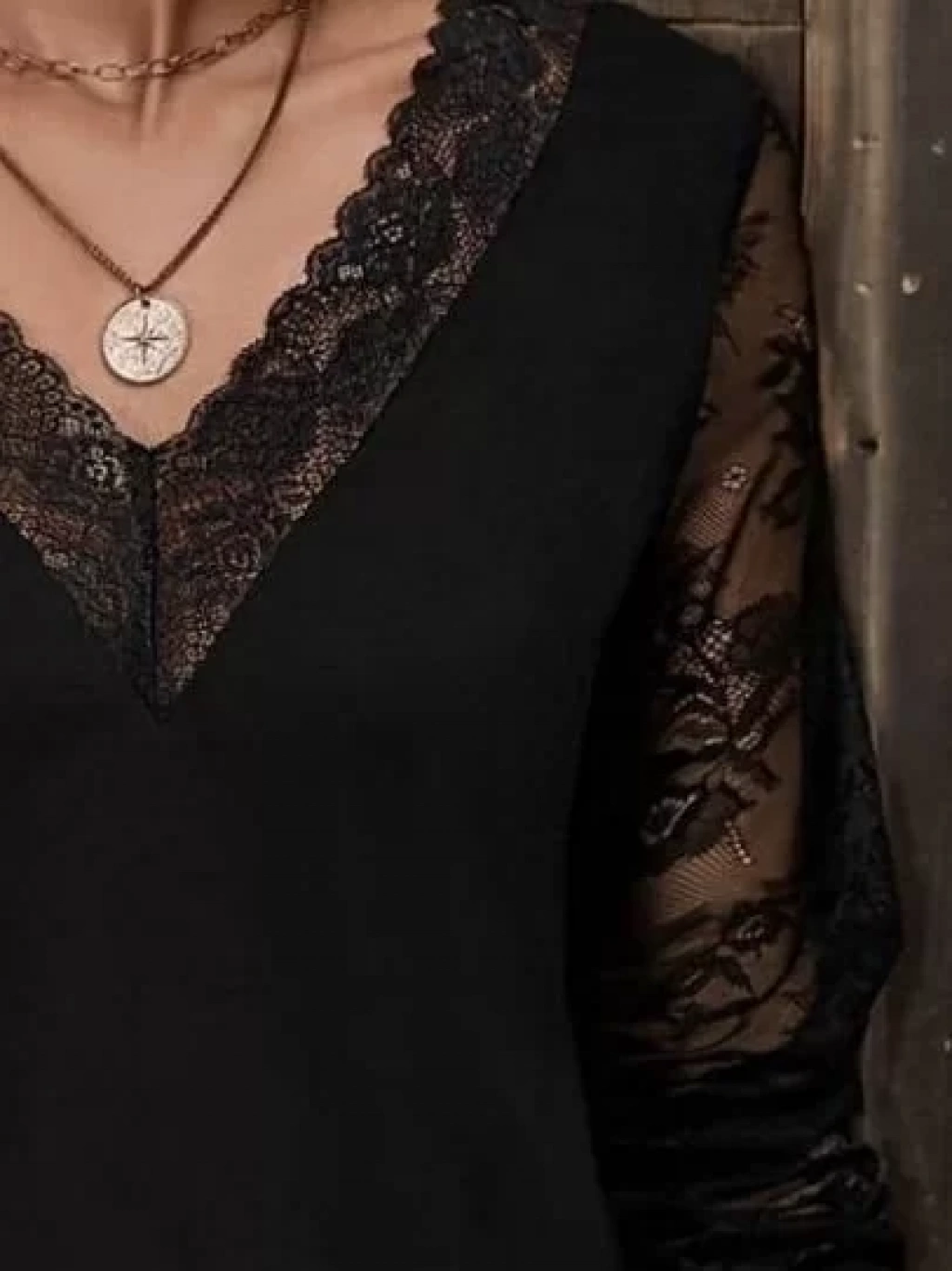 bysoca Kadın V Yaka Yakası ve Kolları Güpür Dantel Detaylı Uzun Kollu Penye Bluz - Siyah