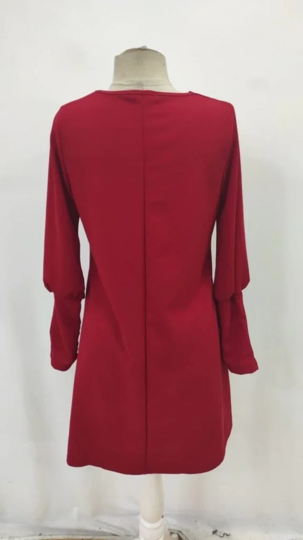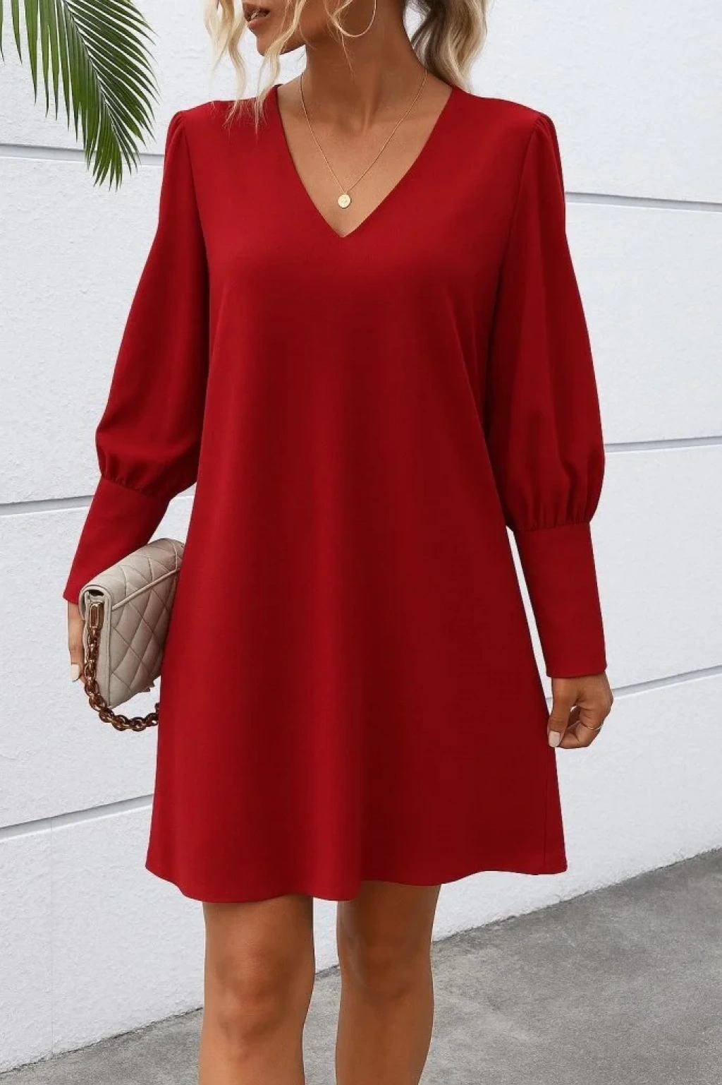 bysoca Kadın V Yaka Balon Kollu Manşeti Düğmeli Rahat Kesim A Kesim Krep Mini Elbise - Kırmızı