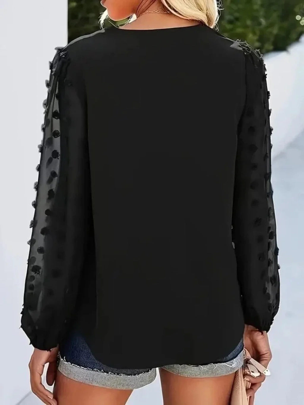 bysoca Kadın V Yaka Kolları Ponponlu Balon Kol Manşetli Rahat Kesim Sandy Kumaş Bluz - Siyah