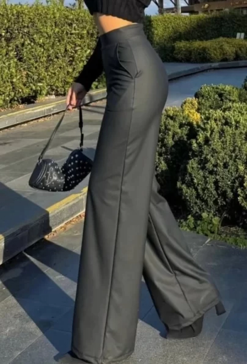 bysoca Kadın Yüksek Bel Cepli Geniş Paça İçi Şardonlu Mat Suni Deri Pantolon - Siyah