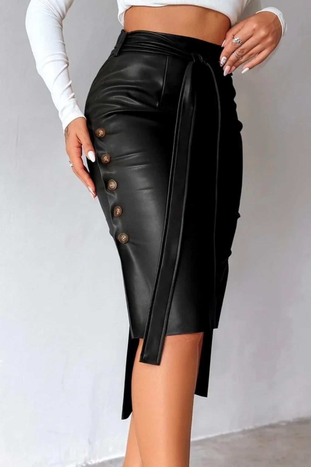 bysoca Kadın Yüksek Bel Beli Kuşaklı Yanı Düğmeli ve Yırtmaçlı Suni Deri Kalem Etek - Siyah