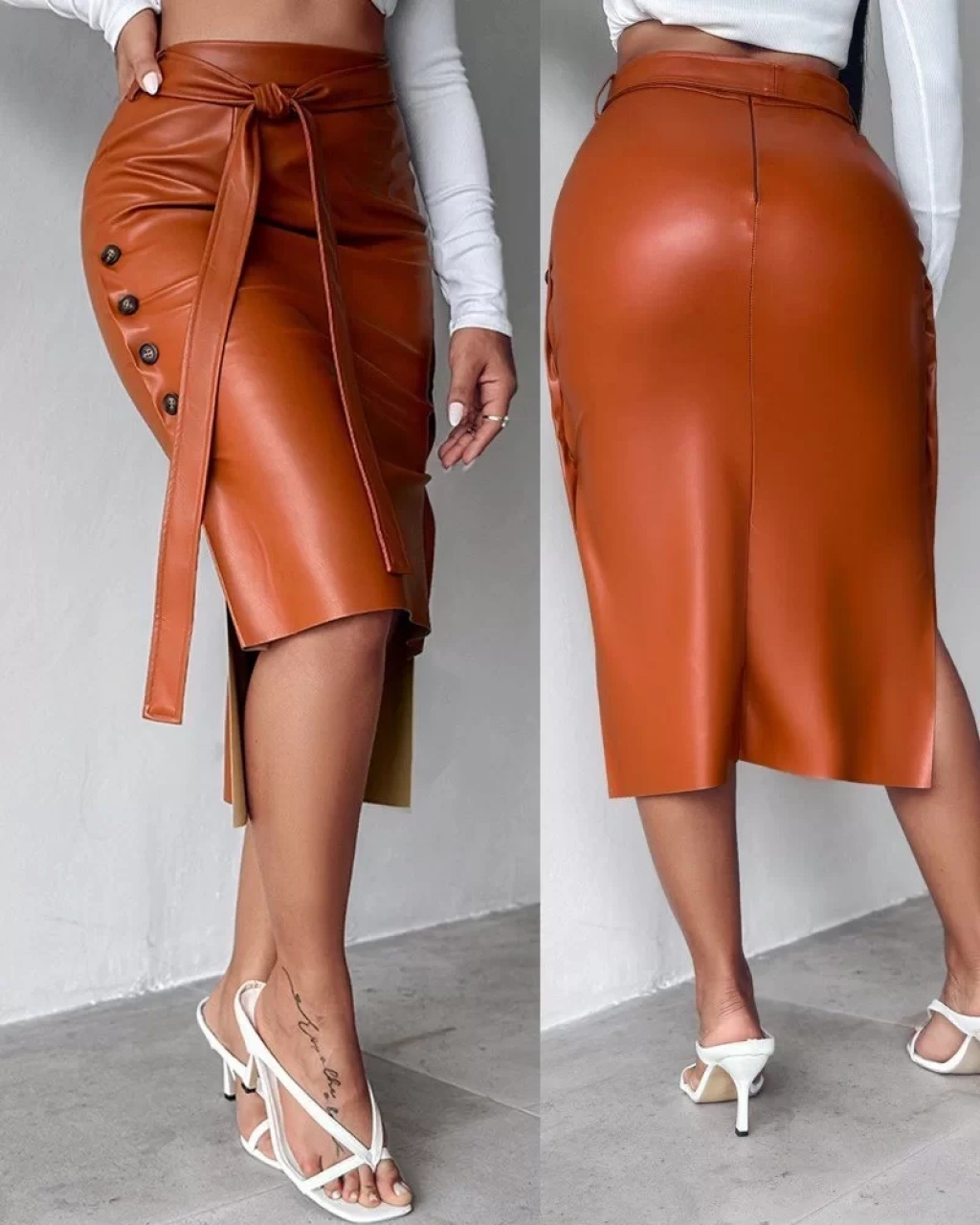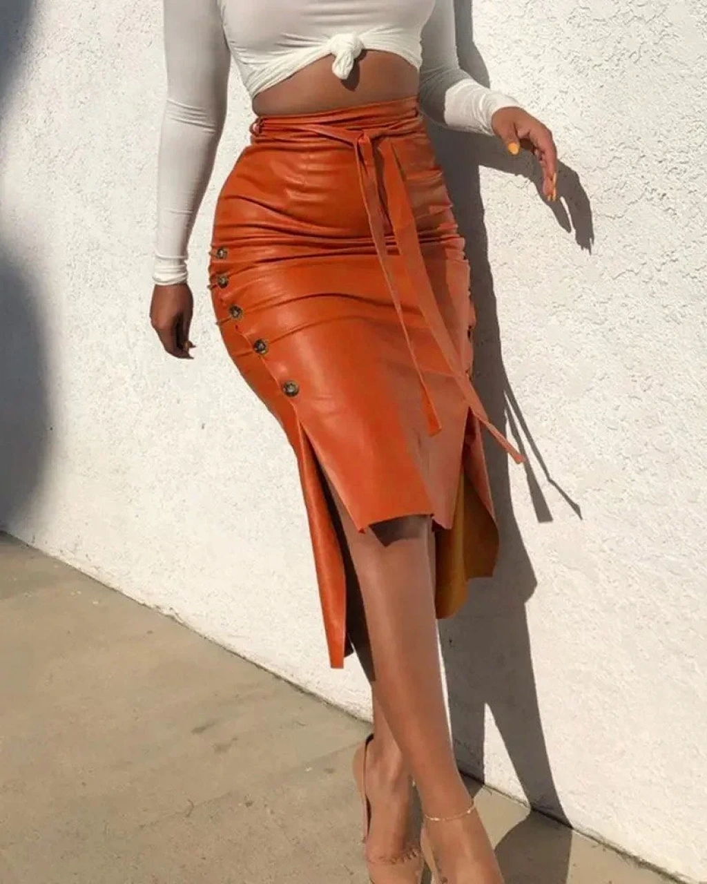 Kadın Yüksek Bel Kuşaklı Yanlardan Düğmeli Mini Deri Etek
