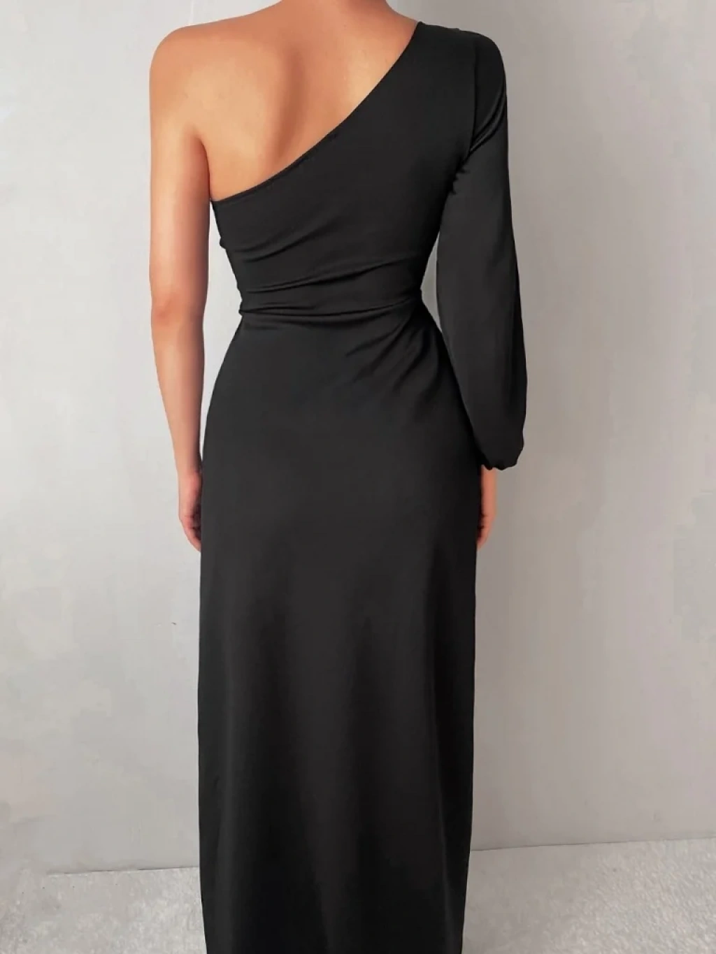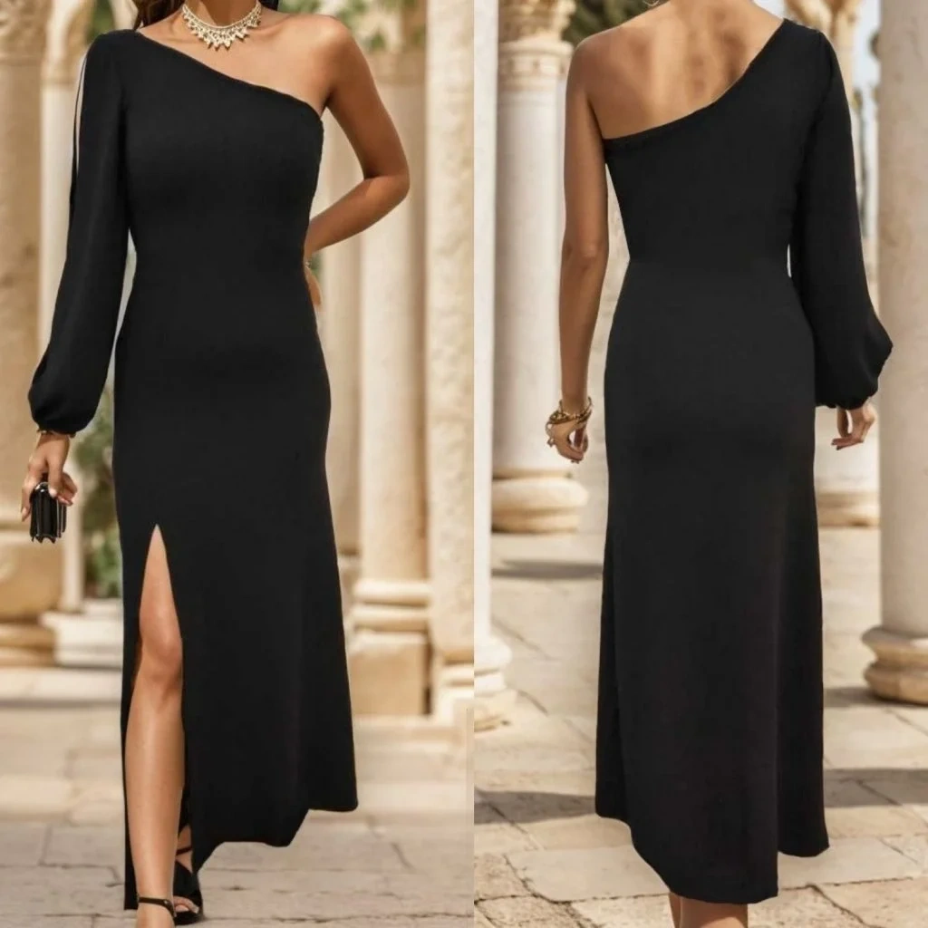 bysoca Kadın Tek Omuz Uzun Kollu Yırtmaçlı Vücudu Saran Kloş Etekli Maxi Abiye Elbise - Siyah